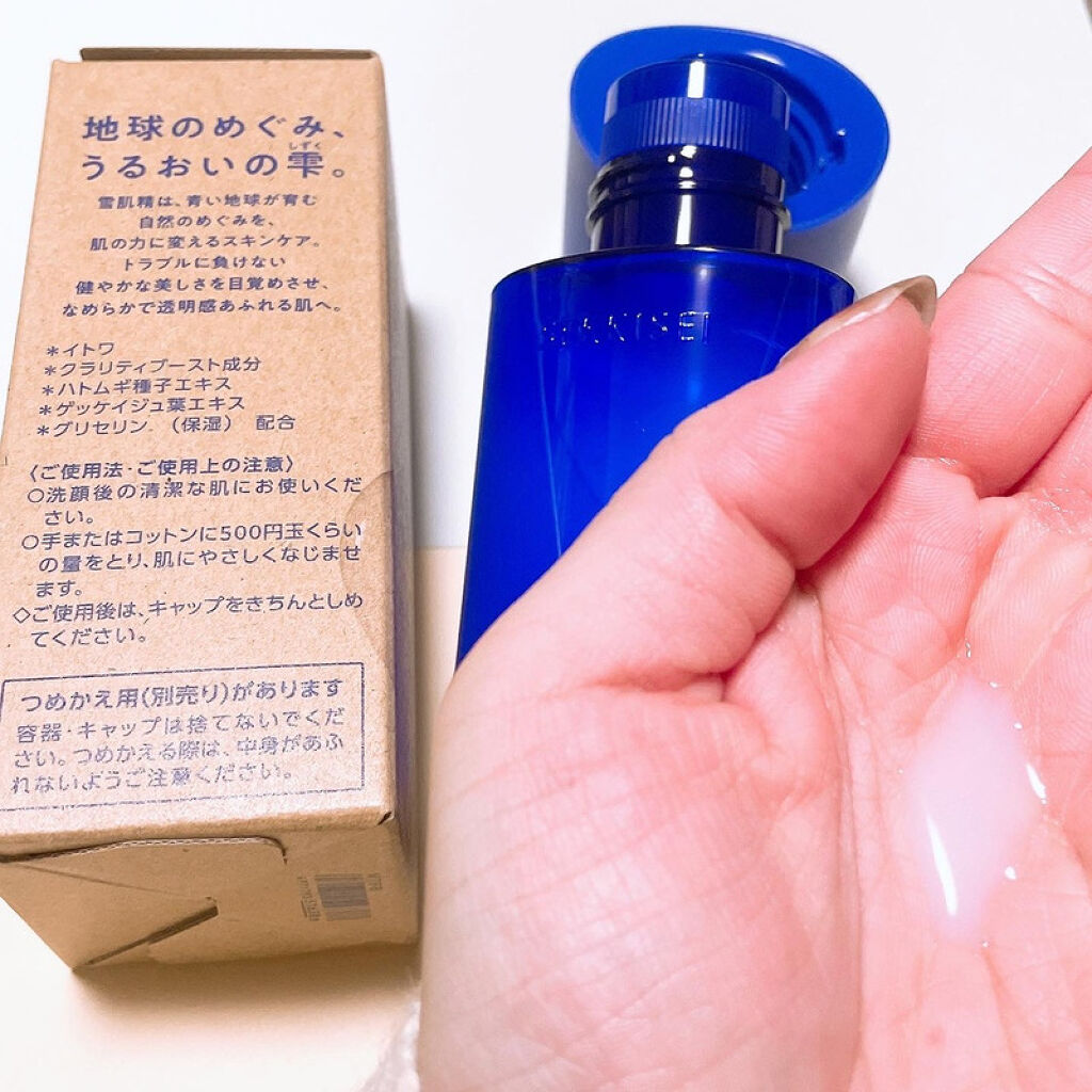 ブルーで雫みたいな形の蓋が特徴的な化粧水です。※写真忘れていました💦すみません。元々雪肌精は気になっていて、その中でも手が出しやすい価格だったので購入しました。白濁色で少しとろっとしたテクスチャーです。前はオルビスユードットの化粧水を使ってい...