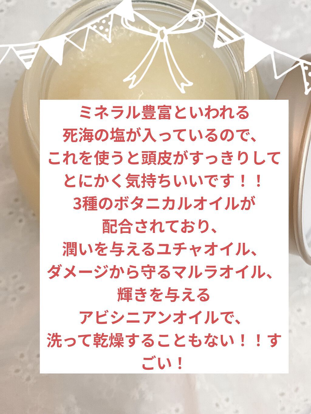 使い心地は凄くいいです! 死海の塩で汚れを取り除き、 3種のボタニカルオイルが保湿して地肌を守ってくれます🤍 洗い上がりはもうスッキリ!の一言。 髪の間の間に空気が入るのがわかる! とにかく!気持ちが良い! 頭皮のケアをすこしプラスするだけで お風呂タイムが楽しくなるかもしれません🛁