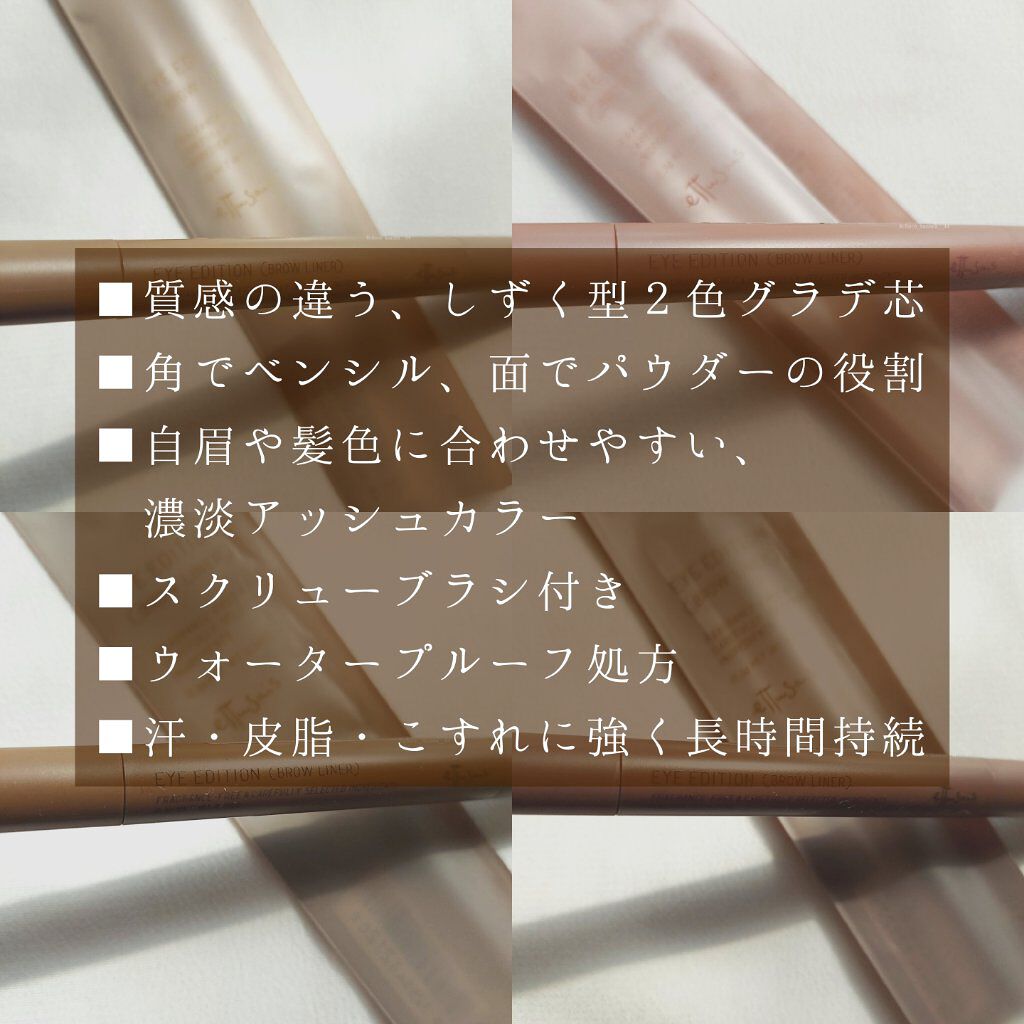- 描き足しながらぼかせる。 ペンシルとパウダーを一つの芯にまとめた 2層芯アイブロウ ●しずく型2色グラデ芯で、自眉となじむ自然な仕上がり ー角の濃いカラーで、1本1本毛を描き足せるような細いラインを実現 ー面の淡いカラーで、自然にぼかしたような仕上がりを実現 ●毛流れを整え、自然になじませるスクリューブラシつき ●ウォータープルーフ処方 ●汗、皮脂、こすれに強く、美しい仕上がりが長時間持続 ●トリートメント成分配合 ースクワラン ●無香料 ●アレルギーテスト済(すべての方にアレルギーが起きないというわけではありません) <使い方> ●芯を2mm程度繰り出してお使いください。 ●芯の角で眉毛を1本1本描き足し、眉頭や輪郭は芯の面の部分でなじませるようにぼかします。 ●芯の出しすぎや落下などの衝撃により折れることがありますのでご注意ください。 ●ご使用後は、芯をもとにくり戻しキャップをきちんとしめてください。 ●ブラシはいつも清潔にしてお使いください。 ●日のあたるところや高温のところにおかないでください。 ●まれに芯の表面に白い粉のようなものがみられますが、品質上問題はありません。