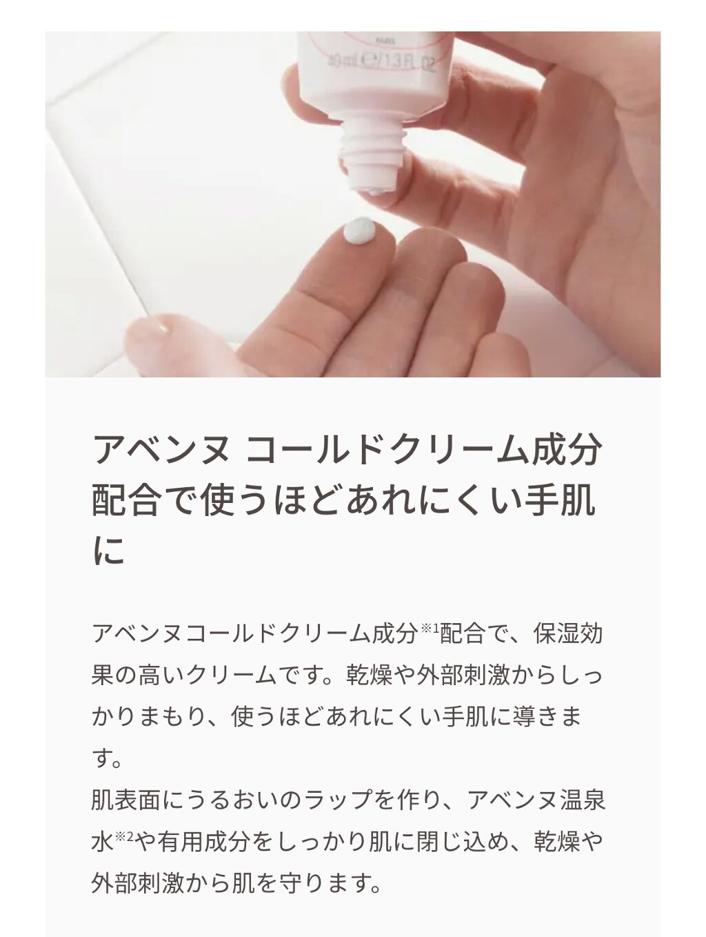 - アベンヌコールドクリーム成分配合で、保湿効果の高いクリームです。乾燥や外部刺激からしっかりまもり、使うほどあれにくい手肌に導きます。 なめらかに伸びて、ベタつかないから、スマホも、仕事も、水仕事もすぐOKです