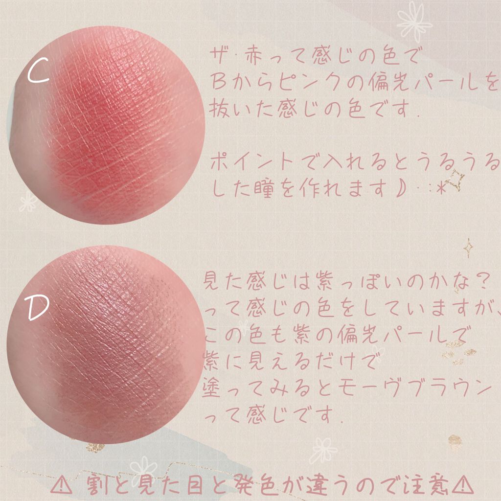 ・マット7色、ラメ1色、シマー1色、グリッター1色 好きな質感に仕上げられるパレットになってます. ・パープルで透明感メイク、ピンクで可愛らしいメイクができます. ・全体的に淡い発色で濃淡の調節がしやすくて、すごく濃いメイクにならない. ・ブラウンが苦手なので締め色が淡いカラーなのが嬉しい. ・パープルは白みとピンクみが強めなのでバブリーにならない. ・瞼のくすみが気になっていたのですが、1のベースカラーを使用すると綺麗にくすみが飛んで気にならなくなった. ・マットが好きなのでマットが多めで嬉しい. ・ラメカラーがどれもかわいい. ・マットは粉飛びするものが多いですが、これはしっとり質感で粉飛びしない. ・なんと言っても全ての色がかわいすぎる!!! ・くすみが苦手な人. ・韓国っぽい白みピンクのメイクがしたい人. ・濃い締め色が苦手な人. ・ラメやシマーで質感を変えて使えるカラーを探して人.