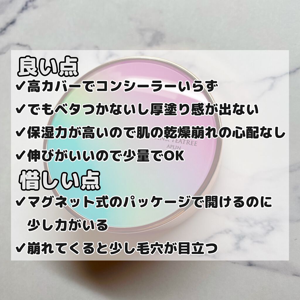APLIN ピンクティーツリーカバークッション 21号ライトベージュ 2,490円(税込) 少量でよく伸びてハイカバー! 赤みやくすみをしっかりカバ一できるのに、厚塗り感のないなめらかな仕上がり♡ ハイカバーなのにナチュラルなツヤ感とサラッとしつつ、乾燥崩れしにくい仕上がりに感動します!!