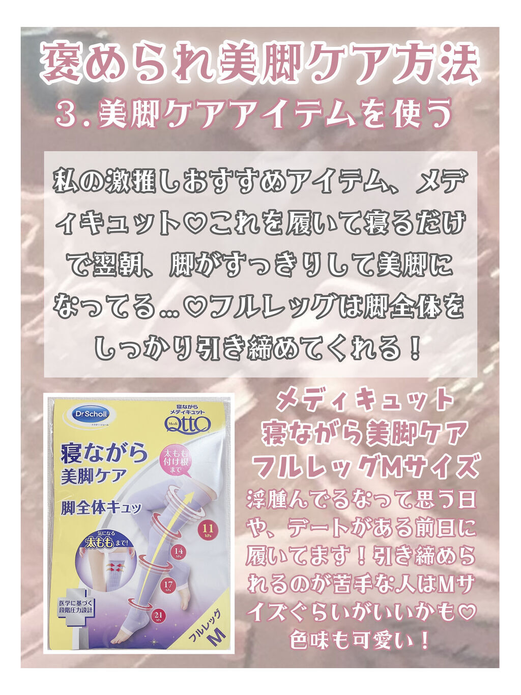 - ※2023年2月2日〜価格改定 寝ながらメディキュット 心地よく寝ている間に、気持ちのいい引き締め感。キュッと軽く。 太もも付け根までのフルレッグタイプで、脚全体じっくりケア メディキュットのおやすみ快適設計 ●寝る時に適した着圧値 寝る時に適した着圧値で、心地よく寝ている間に、効果的に脚を引き締め。 ●寝る時専用の設計 足首は、寝ている姿勢にあわせたフラット設計。 つま先なしで、おやすみ中の熱を発散。 ●やわららか素材使用 コットンフィール素材で、しっかりした着圧とやわらかな肌ざわりの両方を実現。 毎日の美脚習慣、寝ながらメディキュット!特にこんな時にオススメ! 1日中頑張った足をケアしたい日 いつもより足がスッキリしない日 次の日に備えて美脚ケアをしたい日にわらかな肌ざわりの両方を実現。