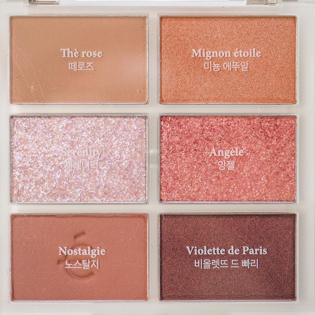 必要なカラーだけがぎゅっと詰まったプロアイパレットミニ🤍 左上の2色は単色で使ったり上下の色を混ぜたりして自分だけのメイクができます✨ 私が使っているのは、ミュートなピンクに目を惹かれる02のロージー ヘイズです。 左下のグリッターが"ピンク、ゴールド、ブルーパールのピンクオパールグリッター"だそうですごく使いやすいし透明感が出る🤍 持ち歩きにも嬉しいサイズ🥳