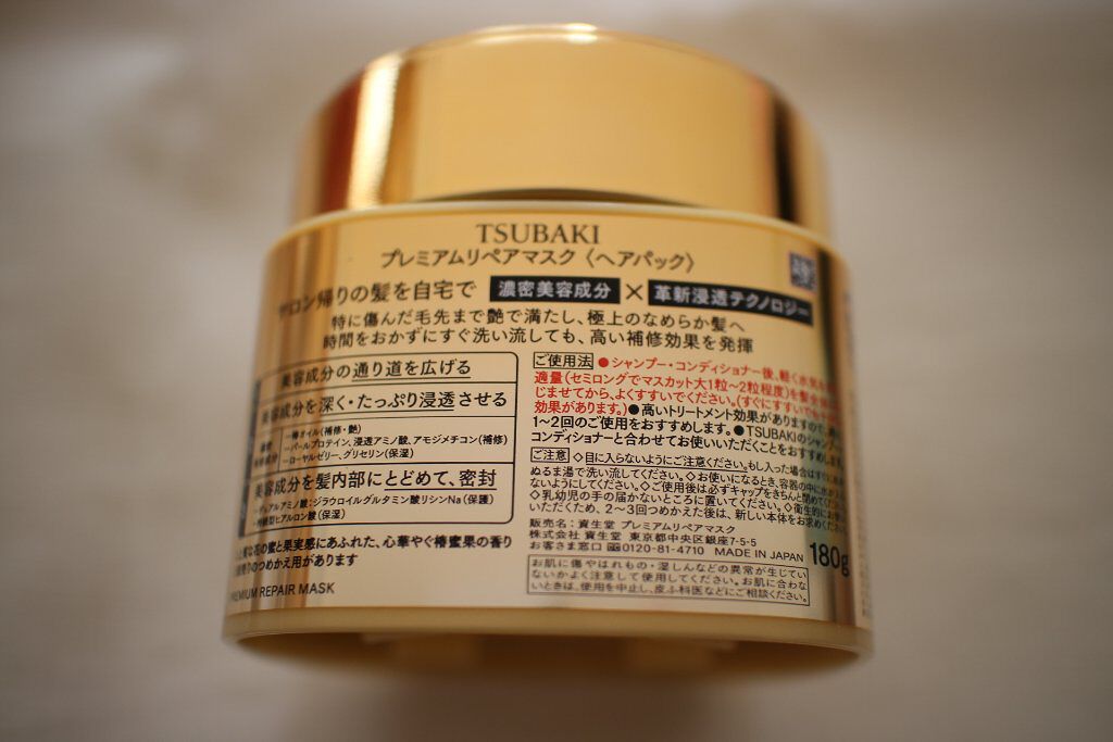 - <つめかえ用> 水、グリセリン、ジメチコン、イソペンチルジオール、水添ナタネ油アルコール、ベヘントリモニウムクロリド、ステアリルアルコール、ソルビトール、アミノプロピルジメチコン、ヒドロキシエチルウレア、アルキル(C12,14)オキシヒドロキシプロピルアルギニンHCl、ステアルトリモニウムクロリド、乳酸、ツバキ種子油、ラウロイルグルタミン酸ジ(フィトステリル/オクチルドデシル)、ジラウロイルグルタミン酸リシンNa、ローヤルゼリーエキス、アセチルヒアルロン酸Na、加水分解コンキオリン、イソプロパノール、セタノール、オクチルドデカノール、エタノール、クエン酸、乳酸アンモニウム、BG、DPG、AMP、アモジメチコン、PPG-2-デセス-12、トコフェロール、フェノキシエタノール、安息香酸Na、香料、赤227、黄4 <プレミアムリペアマスク> 水、グリセリン、ジメチコン、イソペンチルジオール、水添ナタネ油アルコール、ベヘントリモニウムクロリド、ステアリルアルコール、ソルビトール、アミノプロピルジメチコン、ヒドロキシエチルウレア、アルキル(C12,14)オキシヒドロキシプロピルアルギニンHCl、ステアルトリモニウムクロリド、乳酸、ツバキ種子油、ラウロイルグルタミン酸ジ(フィトステリル/オクチルドデシル)、ジラウロイルグルタミン酸リシンNa、ローヤルゼリーエキス、アセチルヒアルロン酸Na、加水分解コンキオリン、イソプロパノール、セタノール、オクチルドデカノール、エタノール、クエン酸、乳酸アンモニウム、BG、DPG、AMP、アモジメチコン、PPG-2-デセス-12、トコフェロール、フェノキシエタノール、安息香酸Na、香料、赤227、黄4 <S (春ツバキの香り)> 水、グリセリン、ジメチコン、イソペンチルジオール、水添ナタネ油アルコール、ベヘントリモニウムクロリド、ステアリルアルコール、ソルビトール、アミノプロピルジメチコン、ヒドロキシエチルウレア、アルキル(C12,14)オキシヒドロキシプロピルアルギニンHCl、ステアルトリモニウムクロリド、乳酸、ツバキ種子油、ラウロイルグルタミン酸ジ(フィトステリル/オクチルドデシル)、ジラウロイルグルタミン酸リシンNa、ローヤルゼリーエキス、アセチルヒアルロン酸Na、加水分解コンキオリン、イソプロパノール、セタノール、オクチルドデカノール、エタノール、クエン酸、乳酸アンモニウム、BG、DPG、AMP、アモジメチコン、PPG-2-デセス-12、トコフェロール、フェノキシエタノール、安息香酸Na、香料、赤227、黄4 <C(限定パッケージ)> 水、グリセリン、ジメチコン、イソペンチルジオール、水添ナタネ油アルコール、ベヘントリモニウムクロリド、ステアリルアルコール、ソルビトール、アミノプロピルジメチコン、ヒドロキシエチルウレア、アルキル(C12、14)オキシヒドロキシプロピルアルギニンHCl、ステアルトリモニウムクロリド、乳酸、ツバキ種子油、ラウロイルグルタミン酸ジ(フィトステリル/オクチルドデシル)、ジラウロイルグルタミン酸リシンNa、ローヤルゼリーエキス、アセチルヒアルロン酸Na、加水分解コンキオリン、イソプロパノール、セタノール、オクチルドデカノール、エタノール、クエン酸、乳酸アンモニウム、BG、DPG、AMP、アモジメチコン、PPG-2-デセス-12、トコフェロール、フェノキシエタノール、安息香酸Na、香料、赤227、黄4