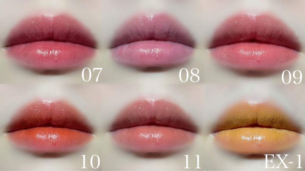 忍ばせイエローの発色が結構強くて 重ねると似てしまうリップが多いように思います。 08のモーヴシャワーを他の色と重ねても コントロールベースみたいに使用できます。青ラメがめちゃくちゃ可愛い✨ 唇の内側からちょっとだけ落ちますが、 正直そんなに目立たない…! 10時間くらい塗り直しなしで生活して みましたが、全然大丈夫でした。