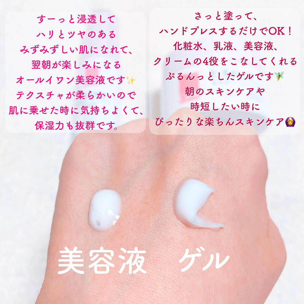 高保湿オールインワン ▷1品4役(化粧水・美容液・乳液・クリーム)の働きを兼ねた高保湿オールインワンゲル 手に取って塗ってみると…最初はちょっとべたつくかな?と思ったものの徐々にスーーっと馴染んでいきました😳 低刺激処方なので肌荒れしてる時でも使いやすいのがとても心強いです❣️