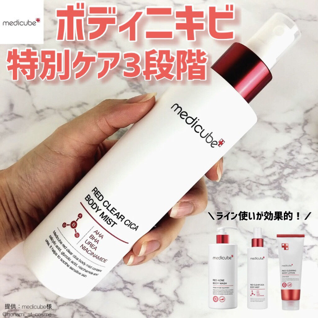 - medicubeイチオシ! 背中のケア、手も届きにくいし、苦労していませんか? 360度どの角度からもしっかり噴射されるように設計されているので、とっても使いやすいミストです。 体の皮膚はお顔のよりも厚く、お顔とは違うケアが必要です。medicubeのミストは、シカ成分*も入っており、体のケアのことを考えてつくられています。 *ツボクサエキス(整肌成分)