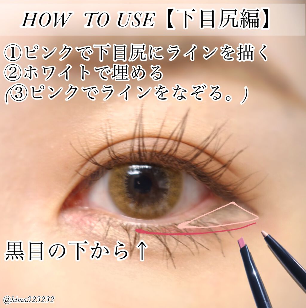 - 下まぶたにアイボリーカラーとニュアンスピンクカラーの2色を塗ることで、目幅を拡張し、白目を自然に大きく見せるWエンドの白目強調※アイライナー。 白目強調・たれ目強調・目幅拡張。 ※下まぶたへのメイクアップ効果による