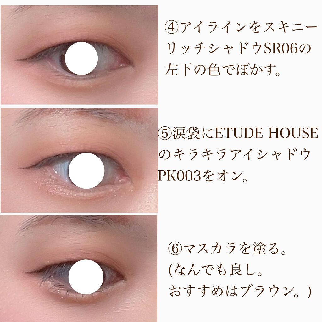 ただブラウンシャドウだけだと目がくすんで見えるタイプの顔をしているので、赤みブラウンをメインに使用しました。 つり目意識で跳ね上げラインを引く。ダークブラウンやブラックのリキッドアイライナーで長めに。 涙袋の影のラインを引き、涙袋にラメをのせる。