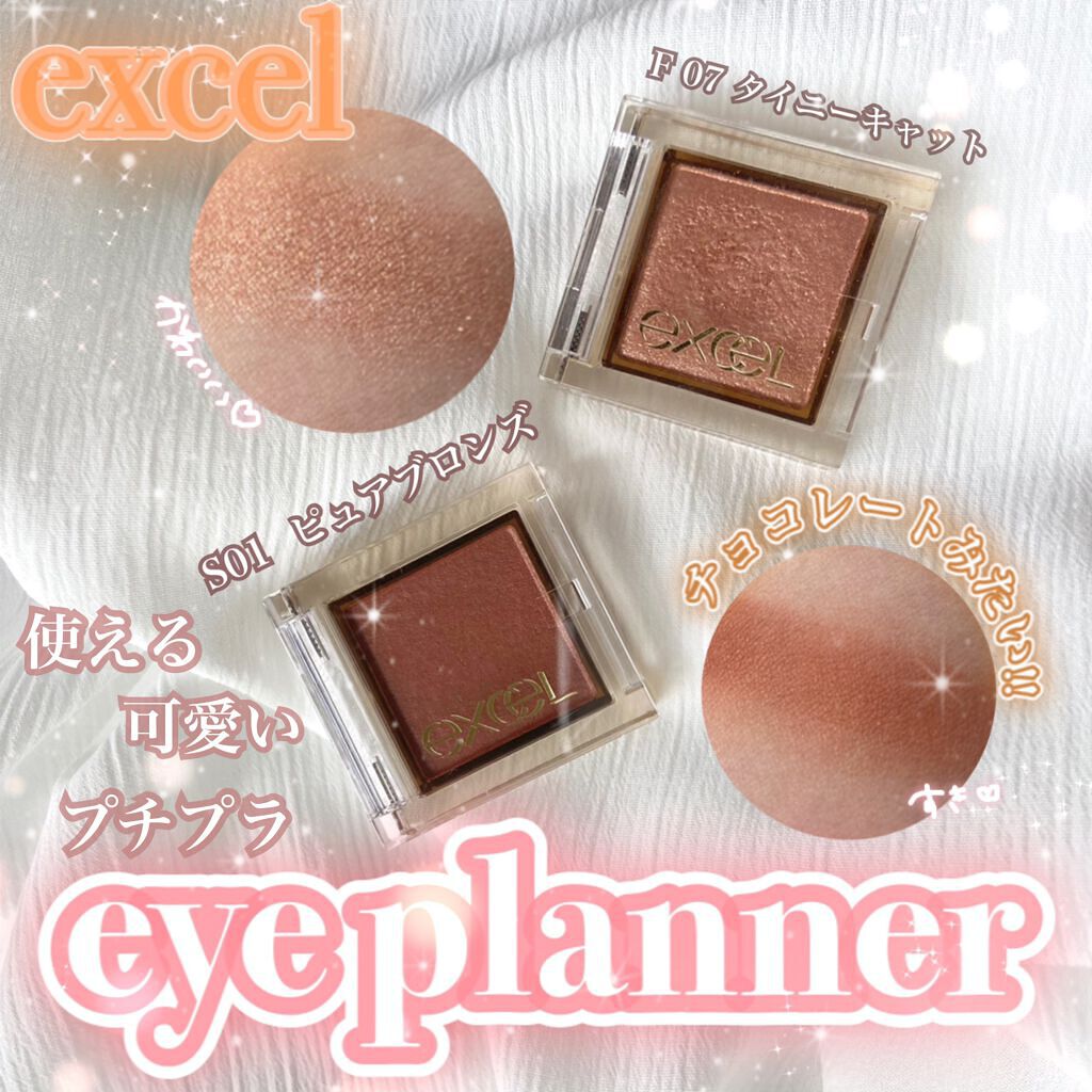 - 「エクセル アイプランナー S/R/F/D」は、質感の異なる4タイプのシングルアイシャドウです。 高輝度パールの“シャイニー”、ツヤ高発色の“リッチ”、新感触セミマットの“フラッフィ”、偏光パールMIXの“ダズル”から、様々な組み合わせをお楽しみいただけます。 単色使いはもちろん、重ねても美しく濁りのないクリアな発色。 フィットオイル*1を配合し、まぶたにピタッと密着して粉飛びやヨレを防ぎます。 集めたくなるシンプル&ミニマムなクリアコンパクトを採用。 色々なカラーやきらめきを自由に組み合わせて、毎日お気に入りの目元をプランニング。 アイメイクの幅が無限大に広がります。 *1 リンゴ酸ジイソステアリル(保湿成分)