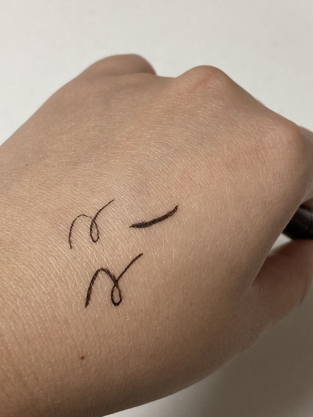 色味も求めてたような、明るすぎず、暗すぎない 丁度いいダークブラウンカラー♥️ 極細筆で細いラインも太いラインも描きやすい✨ 落ちても、パンダ目🐼みたいにはならずで 薄れてる以外は問題ないので、 人に気付かれにくいとは思います👋