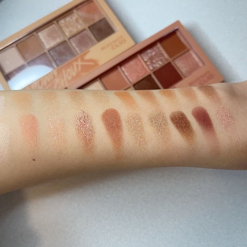 右上のカラーが濃く見えますが、すごく薄めな黄みがかったブラウンなので、締め色というよりはアイホール全体に伸ばすベース色として使用するのがおすすめです🙆♀️ 真っ赤!というよりブラウンよりの赤なので、肌色を選ばず綺麗な落ち着いたピンクメイクができると思います🥰 右上のカラーが1番青みがかっていて、私のように肌が黄色の人は使いづらそうに見えますが、めっちゃくちゃ肌色と馴染みが良くて全く浮きません!