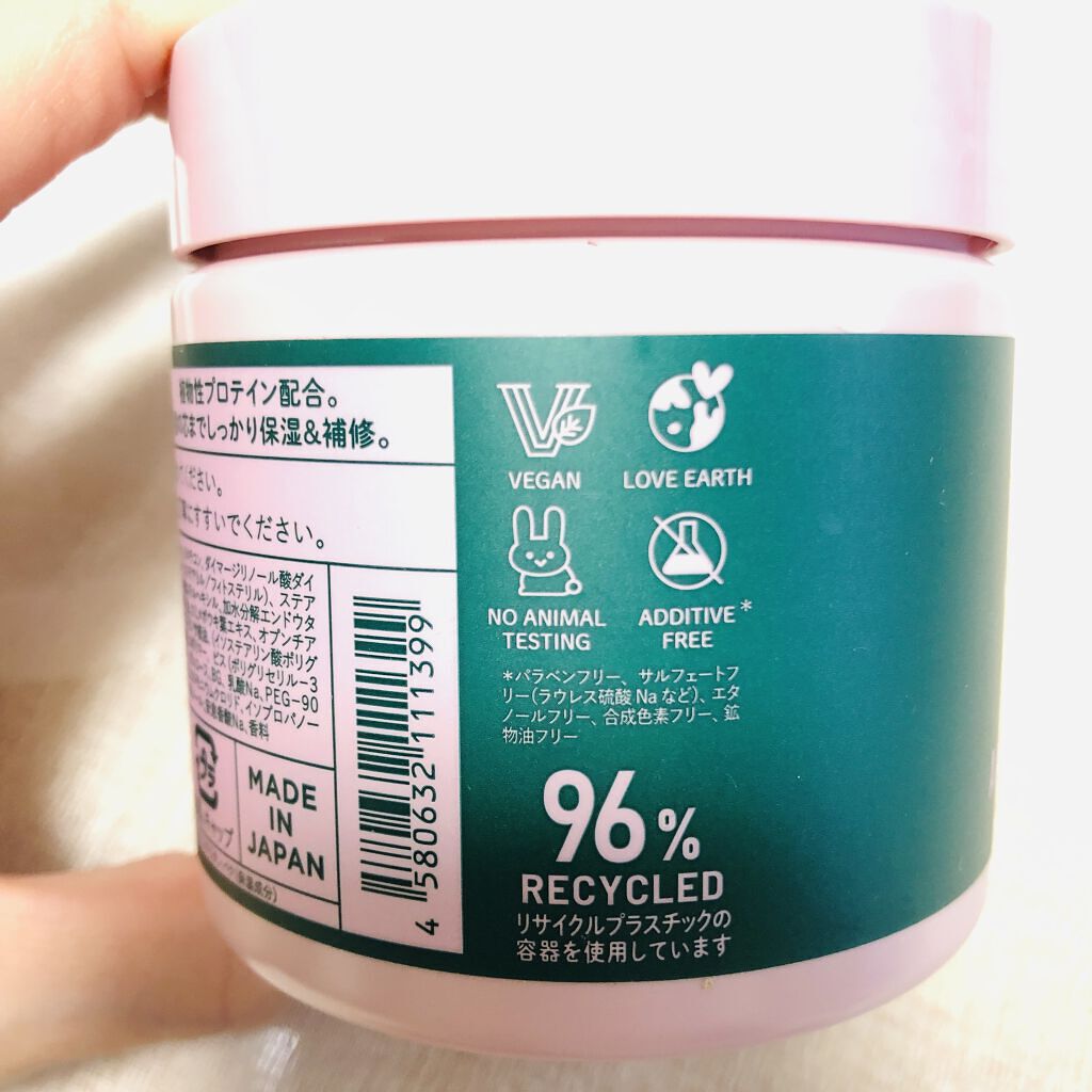 - 植物性プロテイン配合。髪の芯までしっかり保湿&補修するヘアパック。 ●パワーグリーンサラダの香り【バジル/ローズ/ヒノキ】:みずみずしいフルーティローズに、バジル精油がアクセントに香る、深呼吸したくなる香り。 ●ビーガンケラチン(加水分解エンドウタンパク:保湿成分)配合 ●アボカド油・オートミールエキス配合 ●パラベンフリー、サルフェートフリー(ラウレス硫酸Naなど)、エタノールフリー、合成色素フリー、鉱物油フリー