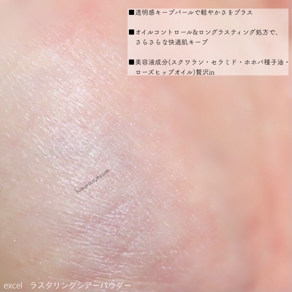 excelラスタリングシアーパウダー¥1,980乾燥せず、軽い仕上がりのフェイスパウダー○使用感・のせた感じがしないほど軽くて乾燥しない。これまで乾燥しないパウダーはNARSのリフ粉だけだったけれど、excelはそれより安いので感動。・プレス...
