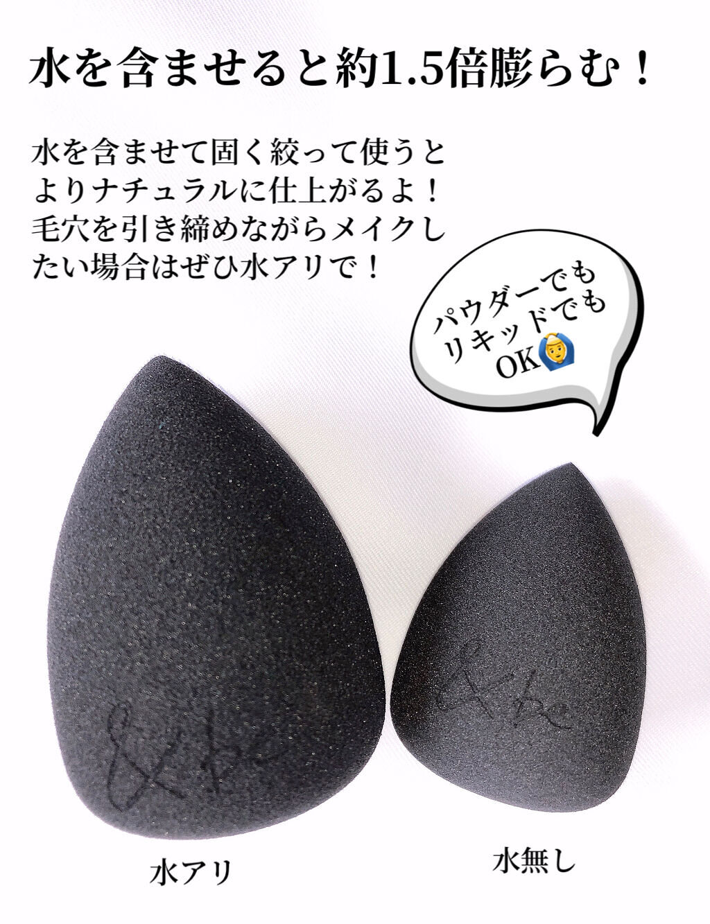 - シリーズ累計320万個※を売り上げた メイクの仕上がりを格段に上げる 大人気スポンジがリニューアル! ※ 2020年4月〜2024年7月までの累計出荷数 ◆ヒアルロン酸配合でなめらかな肌あたり 表面をスムース加工したウレタン製のパフに、新たにヒアルロン酸を配合。肌への摩擦ストレスを軽減し、メイク時に心地よく感じられるようアップデートしました。 ◆細部まで抜かりなく仕上げるプロ仕様設計 先端・側面・底面と360度使える便利なコーン型。コンシーラーなどの塗り伸ばしや境目ぼかしには側面、広い面に塗る際は底面、小鼻のキワや目周りの細部は先端を使うことで、細部までもれなく仕上げることができます。ファンデーションや下地の付けすぎを防ぎ、誰でも簡単にプロ級の仕上がりをお楽しみいただけます。 ◆持ちやすいサイズ設計 女性の手にフィットする絶妙なサイズ感。余分な力をかけずにメイクができ、簡単に使いこなせる形状はメイク初心者の方、不器用な方にもオススメです。 ◆水あり使用も可能 水を含ませて固く絞って使うと、水あり使用でベースメイクを仕上げることも可能※。パウダー製品をナチュラルに塗布したい場合、毛穴を引き締めながらメイクしたい場合は水あり使用をお試しください。 ※水ありで使用する場合、メイク製品に水気がついて菌が繁殖するのを防ぐため、使う分量だけ小皿に分けてご使用ください。 ※2024年11月14日、リニューアル