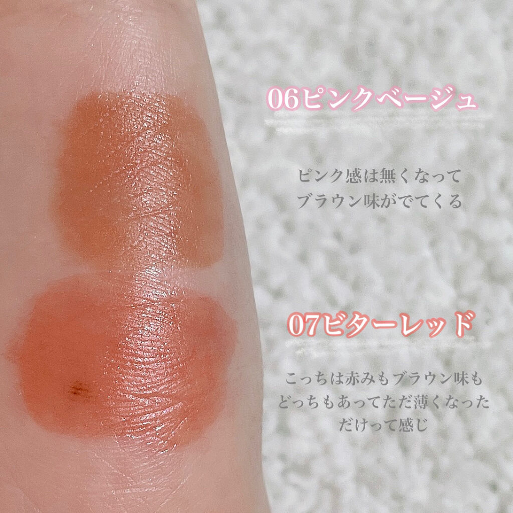 ビターレッドは、茶系の暗めの色かなぁと思ってたんですけど、赤の深みがあるバージョンですごく上品。 ジューシーな感じで、秋冬メイクに最適だと思いました。 ブラシもしなるから塗りやすかった✨ ただ、色落ちは早いかなぁと思いました。 ご飯食べたら完全に取れちゃって、食べなくても3時間くらいが限度でした💦💦 後少しムラになりやすいかなぁ、、。 私の唇が荒れているのもあると思います💦💦 発色はいいので、塗り直せば問題ないです!
