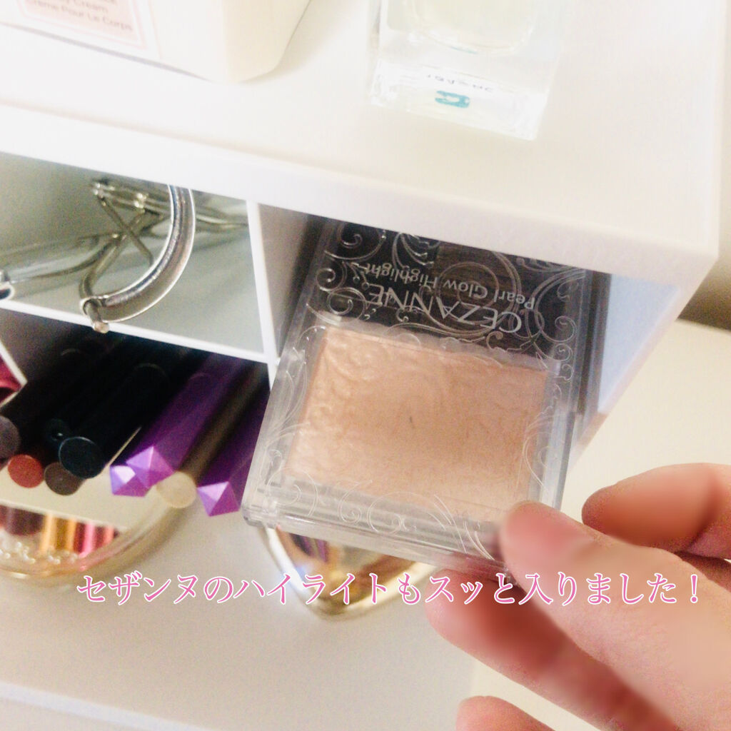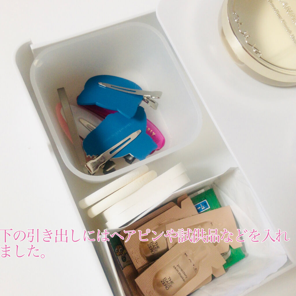 上の段は斜めになっていて、ペン類の出し入れがしやすいうえ、仕切りがあるのでアイブロウだったり、マスカラ系だったりとカテゴリー別にできちゃうので、使いたいものをパッと出せてメイクがスムーズ😳 真ん中にはちょっとした小物だったり、ファンデやフェイスパウダーなんかもおけちゃいます!(そんないっぱいは置けないですが) 更にその下には、引き出しの収納つき⸜(*ˊᗜˋ*)⸝ ここも、ちょっとした小物を入れたり、ブラシなどのストックや、 試供品いれてもいいかなと思います😺