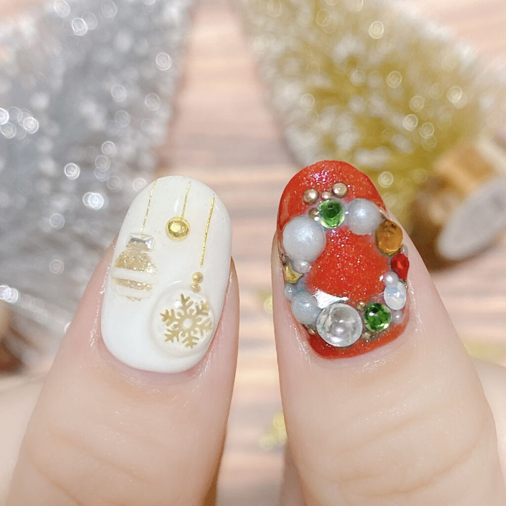 どちらもホワイトクリスマスなデザイン!ショートネイル用のネイルシールとなっています。短い爪や丸い爪、小さい爪の方におすすめ😊 個人的にはキャンドゥの方がおすすめ!シールが柔らかくて貼りやすかった!しかも剥がれにくくてお風呂に入っても大丈夫でした。 デザインはどちらもキラキラしててステキでした✨クリスマスカラーとかではないので、ちょっと早い今の時期でも使いやすかったです😊