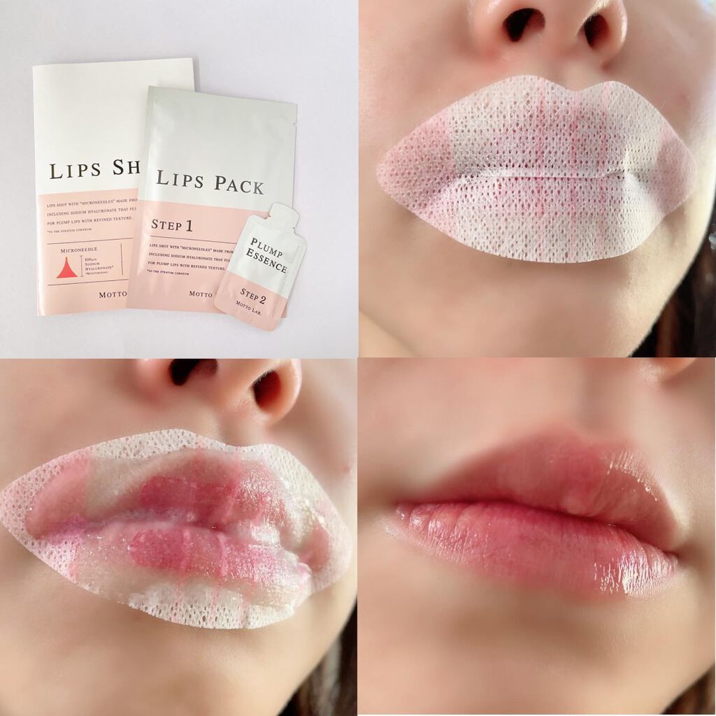 - LIPS SHOTは唇を自然にふっくらさせる唇専用パックです。唇をふっくらさせるヒアルロン酸Naなどのプランプ成分を、針状に結晶化した独自開発のマイクロニードルで、塗るだけでは届かないプランプ成分を唇の角質層までダイレクトに届けることができます。 [セット内容] ・モットラボ リップパック(シート状美容液/1回分) ・モットラボ プランプエッセンス(唇用美容液/2g)