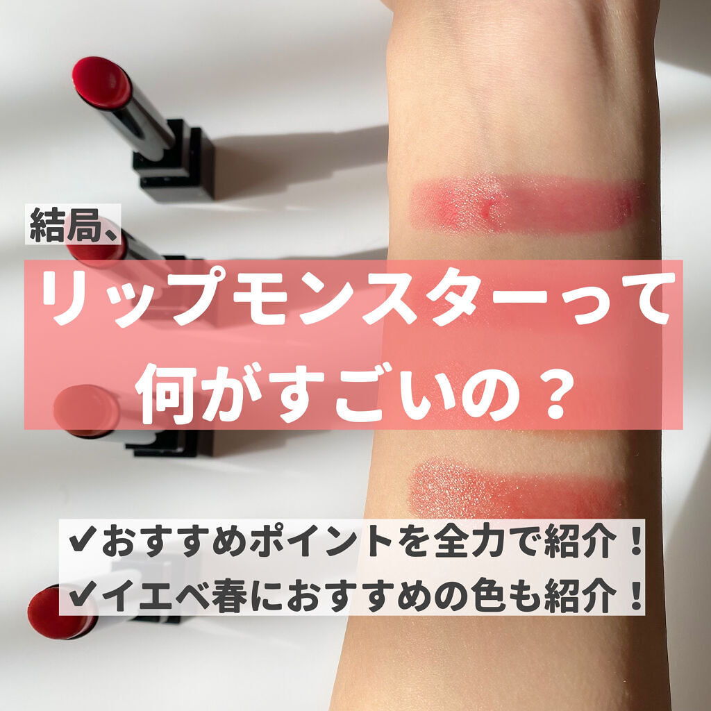 - 落ちにくさも美発色もよくばりたい、つけたての色が長時間持続する人気の口紅リップモンスター。 唇から蒸発する水分を活用して密着ジェル膜に変化する独自技術※で、つけたての色が長時間持続。 高発色&保湿。 ※当社独自の色持ち技術 ■花火のようにまぶしくきらめく 繊細なラメが際立つ限定色 EX-6 ピンクカラー×青ラメ【ロケット花火流星群】 EX-7 オレンジカラー×黄&緑ラメ【100万発の線香花火】 EX-8 レッドカラー×緑ラメ【打ち上げ花火ブランコ】 ■深みレッド系カラーの限定色 EX-9 戦慄の喜笑 (限定色) EX-10 狂気の怒号 (限定色) 【2025クリスマスコフレ】 落ちにくいリップモンスターから、唇の血色感を底上げする ホリデーシーズン限定の熱感ニュアンスベージュ系カラー登場。 EX-11 紅煙宿る贈り物(限定色):ボルドーベージュ系 EX-12 盗まれた1224mの星光(限定色):キャメルベージュ系