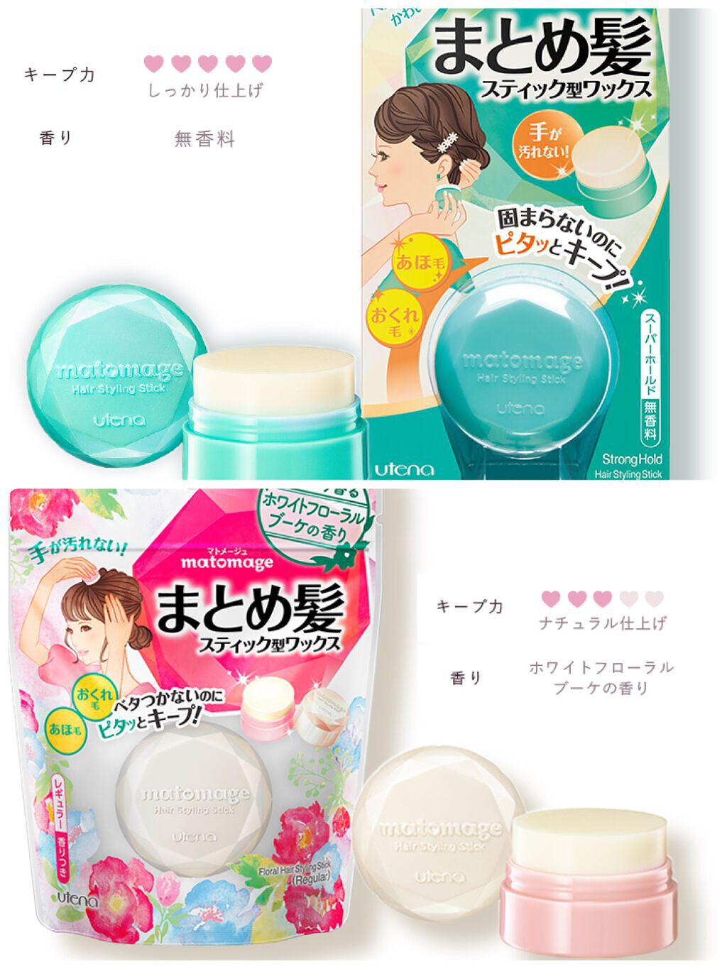 - まとめ髪のおくれ毛やあほ毛をピタッとキープするスティック型ワックス。ナチュラル仕上げのレギュラータイプ。髪に直接なでつけるだけで、バリッと固めずヘアスタイルをキープします。前髪のスタイリングやニュアンスアレンジにも。
