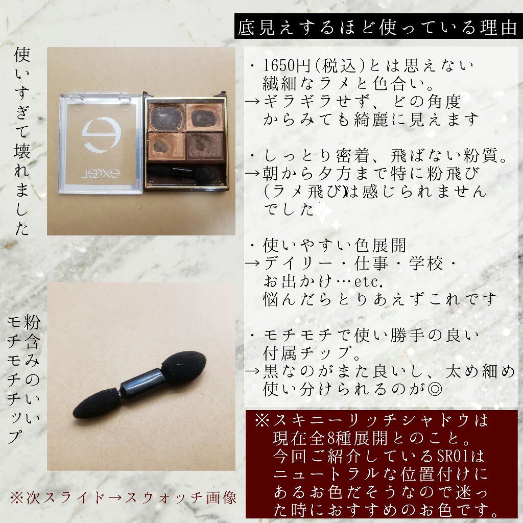 プチプラのブラウン系シャドウといえば、私の中ではエクセルのスキニーリッチシャドウが1番✨ 仕事メイクにぴったりなカラー展開です! しっとりとした粉質でラメも飛びにくく、超優秀😆 オンオフ問わず使えるカラーが揃っているので、1つ持っておくと重宝すると思います😊 スキニーリッチシャドウシリーズはブラウン系カラーが充実していますので、他のカラーも試したくなっちゃう☺️