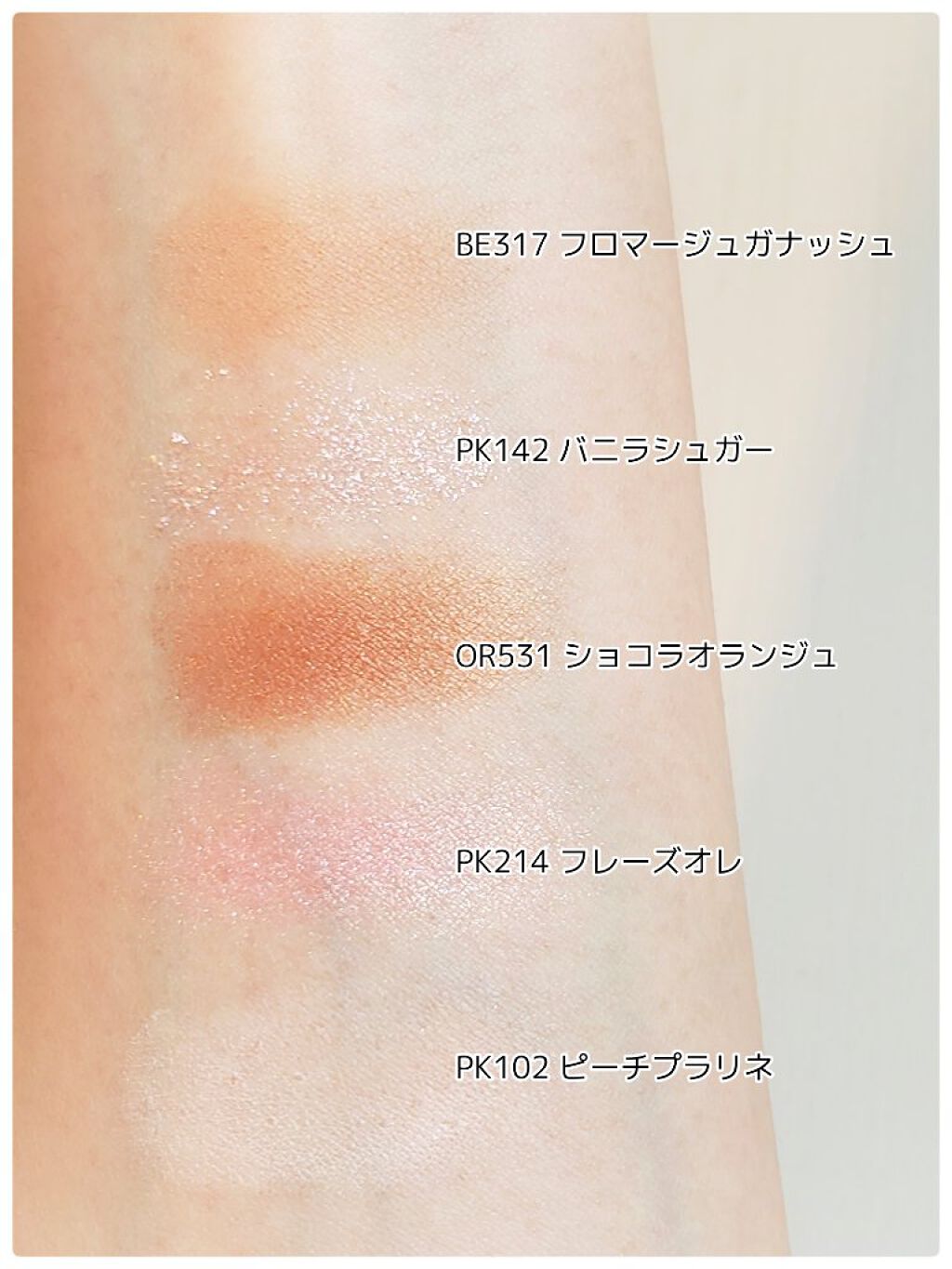 - <P BL164 アクアマリンシュガー(限定)> ホウケイ酸(Ca/Al)、ホウケイ酸(Ca/チタン)、ステアリン酸Mg、フェニルトリメチコン、ホウケイ酸(Ca/Na)、リンゴ酸ジイソステアリル、シリカ、アルキル(C20-24)ジメチコン、ステアロイルオキシステアリン酸オクチルドデシル、タルク、合成フルオロフロゴパイト、オレフィン(C20-24)、メチルプロパンジオール、ミリスチン酸Mg、ナイロン-12、プロパンジオール、酸化スズ、ジメチコン、トリエトキシカプリリルシラン、水、酸化チタン、マイカ、酸化鉄、グンジョウ、コンジョウ、青1 <P BR763 スモーキークォーツ(限定)> タルク、リンゴ酸ジイソステアリル、ポリエチレン、シリカ、トリエチルヘキサノイン、ワセリン、ミリスチン酸亜鉛、酸化亜鉛、アセチルヒアルロン酸Na、セスキイソステアリン酸ソルビタン、ダイマージリノール酸ジ(イソステアリル/フィトステリル)、トリエトキシシリルエチルポリジメチルシロキシエチルヘキシルジメチコン、エチルヘキシルグリセリン、酸化スズ、ケイ酸(Li/Mg/Na)、テトラヒドロテトラメチルシクロテトラシロキサン、グリセリン、ジメチルシリル化シリカ、トコフェロール、PEG/PPG-300/55コポリマー、テトラデセン、ホウケイ酸(Ca/Al)、ヒドロキシプロピルセルロース、マイクロクリスタリンワックス、(ジメチルアクリルアミド/アクリロイルジメチルタウリンNa)クロスポリマー、EDTA-2Na、クエン酸Na、クエン酸、クロルフェネシン、マイカ、合成金雲母、酸化チタン、酸化鉄、グンジョウ <P PK261 ローズクォーツ(限定)> タルク、リンゴ酸ジイソステアリル、ポリエチレン、トリエチルヘキサノイン、ワセリン、酸化亜鉛、ミリスチン酸亜鉛、アセチルヒアルロン酸Na、セスキイソステアリン酸ソルビタン、ダイマージリノール酸ジ(イソステアリル/フィトステリル)、トリエトキシシリルエチルポリジメチルシロキシエチルヘキシルジメチコン、エチルヘキシルグリセリン、酸化スズ、シリカ、ケイ酸(Li/Mg/Na)、グリセリン、ジメチルシリル化シリカ、テトラヒドロテトラメチルシクロテトラシロキサン、水酸化Al、トコフェロール、PEG/PPG-300/55コポリマー、テトラデセン、ホウケイ酸(Ca/Al)、ヒドロキシプロピルセルロース、マイクロクリスタリンワックス、(ジメチルアクリルアミド/アクリロイルジメチルタウリンNa)クロスポリマー、EDTA-2Na、クエン酸Na、クエン酸、クロルフェネシン、合成金雲母、マイカ、酸化チタン、酸化鉄、グンジョウ、カルミン <P VI262 ラベンダーアメジスト(限定)> タルク、リンゴ酸ジイソステアリル、ポリエチレン、ホウケイ酸(Ca/Al)、トリエチルヘキサノイン、ワセリン、ミリスチン酸亜鉛、酸化亜鉛、アセチルヒアルロン酸Na、セスキイソステアリン酸ソルビタン、ダイマージリノール酸ジ(イソステアリル/フィトステリル)、トリエトキシシリルエチルポリジメチルシロキシエチルヘキシルジメチコン、酸化スズ、エチルヘキシルグリセリン、ケイ酸(Li/Mg/Na)、シリカ、グリセリン、ジメチルシリル化シリカ、トコフェロール、PEG/PPG-300/55コポリマー、テトラヒドロテトラメチルシクロテトラシロキサン、テトラデセン、ヒドロキシプロピルセルロース、マイクロクリスタリンワックス、(ジメチルアクリルアミド/アクリロイルジメチルタウリンNa)クロスポリマー、EDTA-2Na、クエン酸Na、クエン酸、クロルフェネシン、合成金雲母、マイカ、酸化チタン、グンジョウ、酸化鉄、コンジョウ、赤226