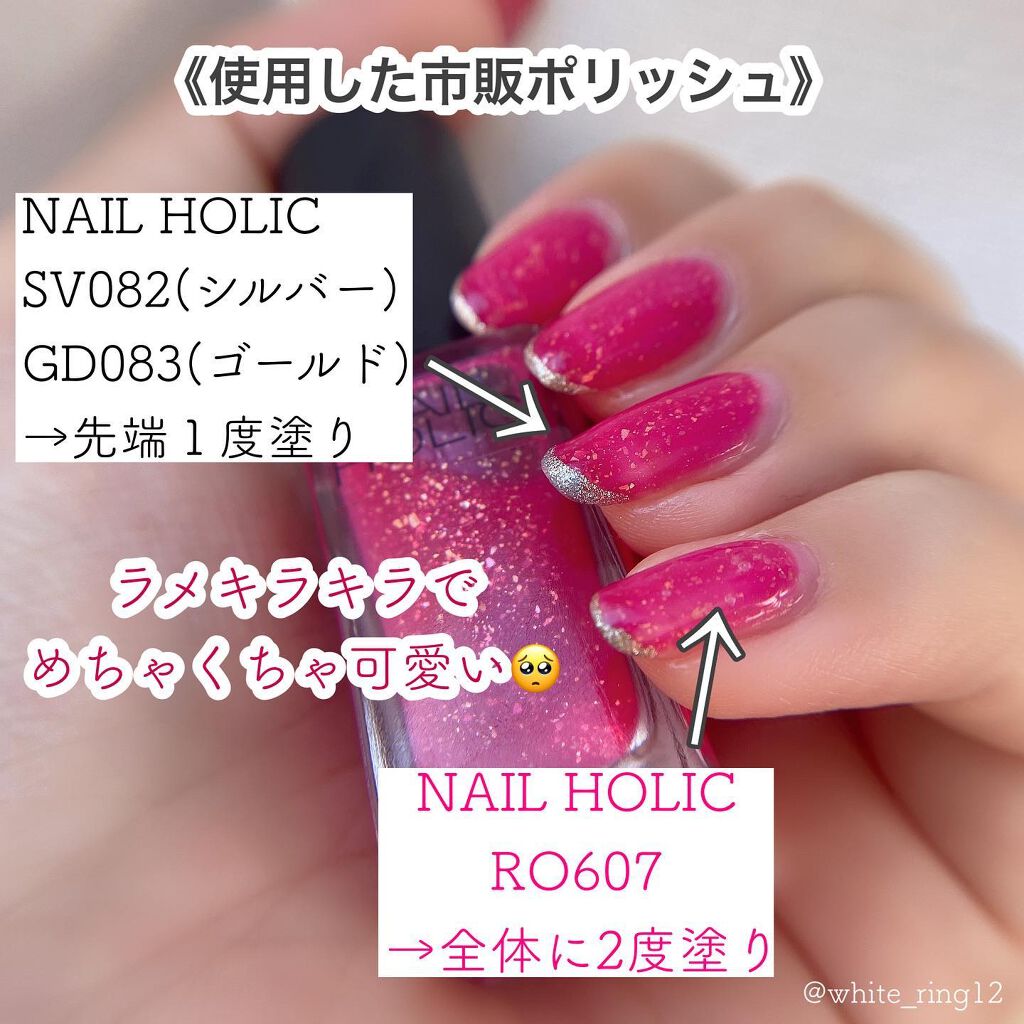 ネイルホリックの3本を使用して流行のガラスフレンチネイルをしてみました❣️なんと1本400円ほどなんです…! 素爪よりはピンクみが強く先端はホログラム入りのラメでキラキラしてかわいい、、、! しかも先端ラメだと欠けにくいです🥰 ベースカラーもシアーでかわいい🥰シルバーとゴールドのポリッシュは細筆なのでわりと描きやすいです🙌 季節問わず使えるのでぜひぜひ参考にしてみてください✨