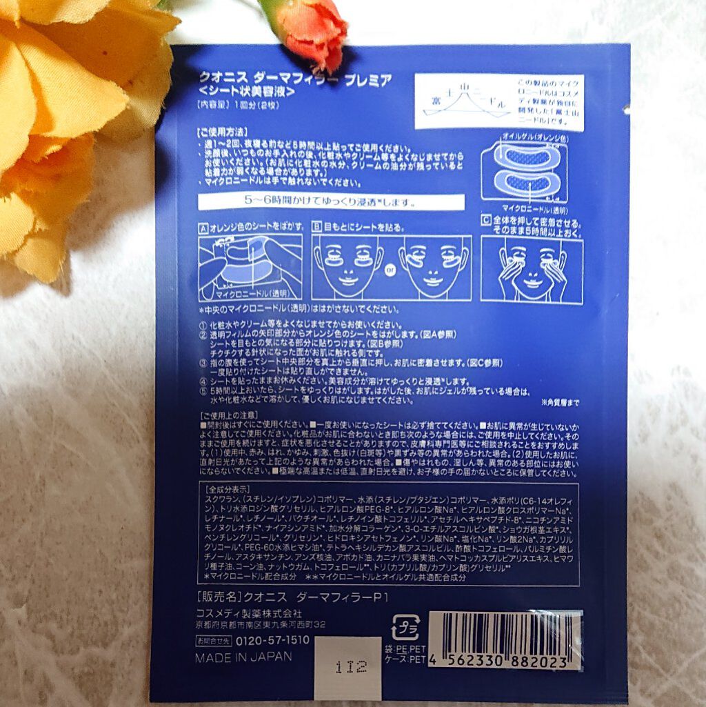 - ~世界で初めて※1マイロニードル化粧品を製品化したコスメディ製薬~ 経皮浸透技術を研究するコスメディ製薬は、自社化粧品ブランド「クオニス」の目元用マイクロニードル「ダーマフィラープレミア」を2021年11月25日(木)にリニューアル発売。 目元の“ハリ”強化にこだわり、独自開発した「持続型ヒアルロン酸※2」と「立体型ヒアルロン酸※3」に加え、レチノール※4、レチナール※4を配合。さらに、針の本数を従来品よりも約2.5倍アップさせ、3,800本※5の針でダイレクトに成分を届けます※6。 ※1 公益社団法人日本薬剤学会発行 学会誌「薬剤学」より ※2 ヒアルロン酸PEG-8(ハリを与える) ※3ヒアルロン酸クロスポリマーNa(ハリを与える) ※4 整肌成分 ※5 1回分あたり ※6 角質層まで