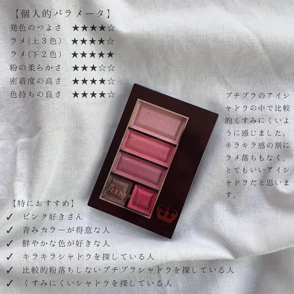 | 粉質はしっとりしててまぶたに綺麗に密着◎少量でもかなり発色してくれて色持ちもいい | 詳細を見る | ||
