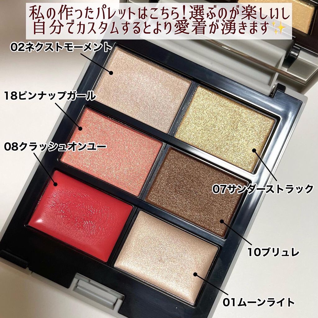 - 他のだれでもないわたし自身の美しさをみつけ出し、何通りもの表情を楽しむマルチパレット アイシャドウ、リップ&チーク、ハイライトのバリエーションから、肌の色や普段のスタイル、気分や理想像などにあわせてフィットする6種を割り出し、自在に組み合わせたコンパクトなマルチパレット。オリジナルの美しさを彩る組み合わせは実に260万通りもの可能性に満ちており、自分らしさを反映した組み合わせにすることで、いくつもの自分らしい表情を探究することができ、パレットにありがち な「使わない色」をなくします。レフィル形式のため、カラーを買い足して組み替えることも容易です。