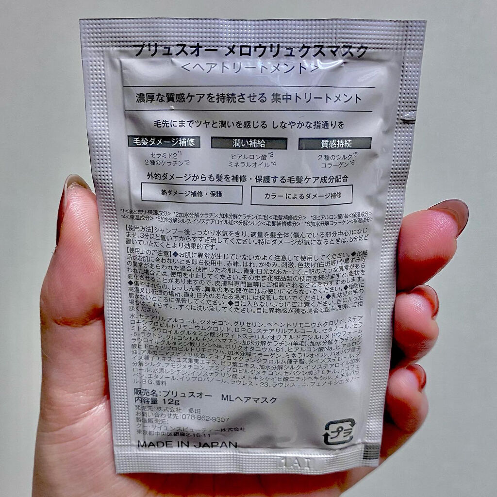 - <本体200g> 水、セテアリルアルコール、ジメチコン、グリセリン、ベヘントリモニウムクロリド、ステアロキシプロピルトリモニウムクロリド、DPG、ステアリルアルコール、セタノール、セラミド2、ラウロイルグルタミン酸ジ(フィトステリル/オクチルドデシル)、メドウフォーム -δ-ラクトン、グルコシルルチン、ヘマチン、加水分解ケラチン(羊毛)、加水分解ケラチン、ジラウロイルグルタミン酸リシンNa、ポリクオタニウム-61、ヒアルロン酸Na、ヒアルロン酸ヒドロキシプロピルトリモニウム、加水分解コラーゲン、ミネラルオイル、バオバブ種子油、アルガニアスピノサ核油、テオブロマグランジフロルム種子脂、ダイズステロール、ダイズ種子エキス、ユズ果実エキス、ビワ葉エキス、加水分解シルク、イソステアロイル加水分解シルク、アモジメチコン、アミノプロピルジメチコン、セバシン酸ジエチル、トコフェロール、水添レシチン、イソステアリン酸、メトキシケイヒ酸エチルヘキシル、メチルパラベン、エタノール、イソプロパノール、ラウレス - 23、ラウレス - 4、フェノキシエタノール、BG、香料 <4回分> 水、セテアリルアルコール、ジメチコン、グリセリン、ベヘントリモニウムクロリド、ステアロキシプロピルトリモニウムクロリド、DPG、ステアリルアルコール、セタノール、セラミド2、ラウロイルグルタミン酸ジ(フィトステリル/オクチルドデシル)、メドウフォーム -δ-ラクトン、グルコシルルチン、ヘマチン、加水分解ケラチン(羊毛)、加水分解ケラチン、ジラウロイルグルタミン酸リシンNa、ポリクオタニウム-61、ヒアルロン酸Na、ヒアルロン酸ヒドロキシプロピルトリモニウム、加水分解コラーゲン、ミネラルオイル、バオバブ種子油、アルガニアスピノサ核油、テオブロマグランジフロルム種子脂、ダイズステロール、ダイズ種子エキス、ユズ果実エキス、ビワ葉エキス、加水分解シルク、イソステアロイル加水分解シルク、アモジメチコン、アミノプロピルジメチコン、セバシン酸ジエチル、トコフェロール、水添レシチン、イソステアリン酸、メトキシケイヒ酸エチルヘキシル、メチルパラベン、エタノール、イソプロパノール、ラウレス - 23、ラウレス - 4、フェノキシエタノール、BG、香料