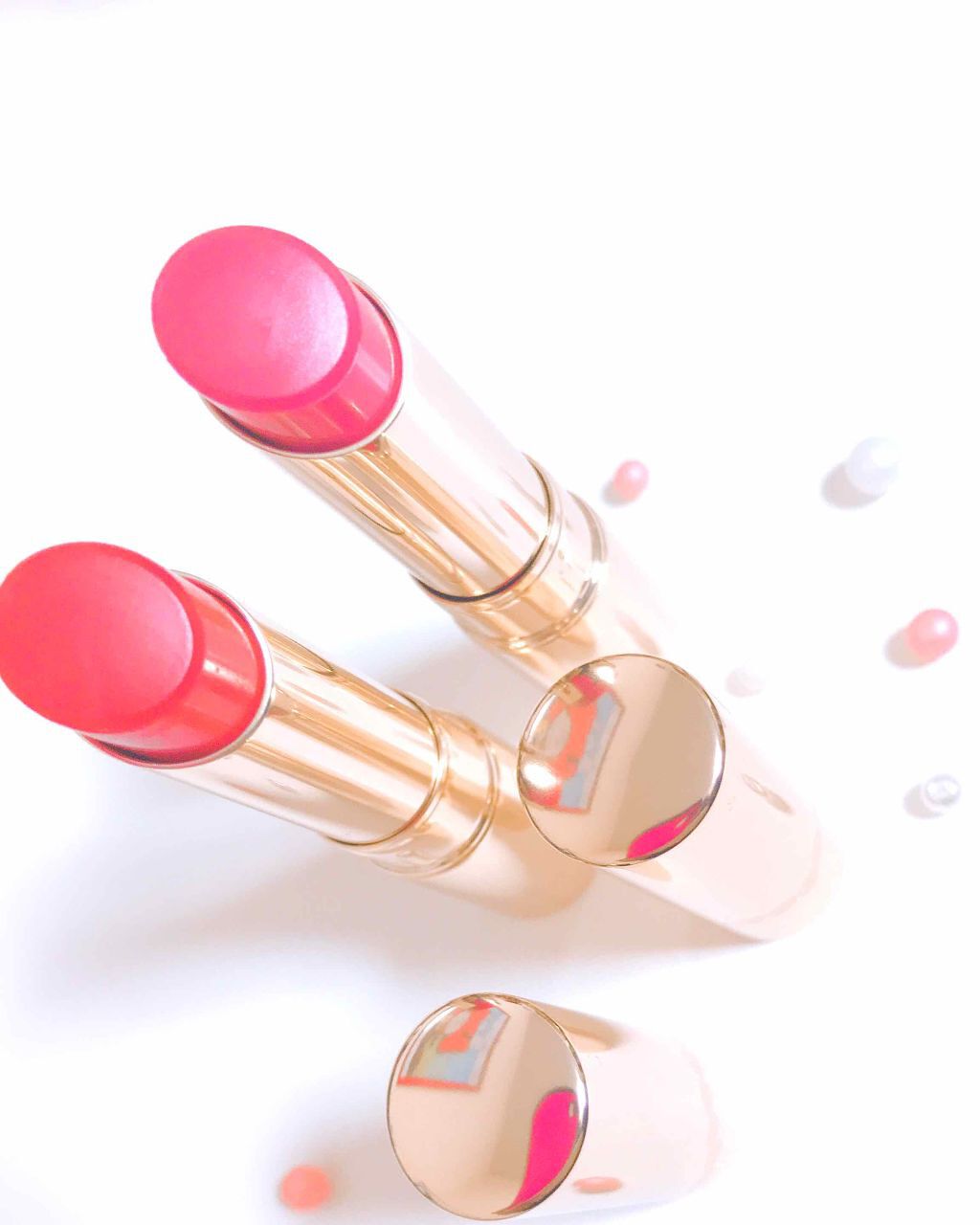 多幸感あふれるクリアなコーラル🩷 特に時間が経つと蛍光感がでてきちゃう。 THEピンクのリップを求めている人にピッタリ! ティッシュオフしても若干色は残ってる! おすすめの塗り方は、いつもよりも少し濃いめに塗ってから、ティッシュオフ!