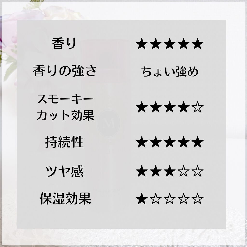 【 オススメポイント① 】香り 女の子の香り、が一番適切な表現で間違いない🧚♀️ フローラルだけど甘ったるくなく、さわやかな感じ🌸 そして、結構長続き♥ 【 オススメポイント② 】スモーキーカット効果 イヤな匂い😵💫をブロックしてくれるんです〜〜 焼肉とか行ったあとでも、髪だけ良い香りのまま! なんてステキ!!! 【 オススメポイント③ 】意外と被らない あんまり人と被りません!!! (ダカラ本当は教えたくない🤫笑) お洒落なあのコ 可愛いあのコ 格好良いあのコ 思い出してみてください。 皆さん、 化粧品ブランドのもの、香水メーカーのものとか 割とお高いところ、使ってません??? だから!!! コレが穴場なんです。 狙い目です。 だってこれ、超優秀でしょう???