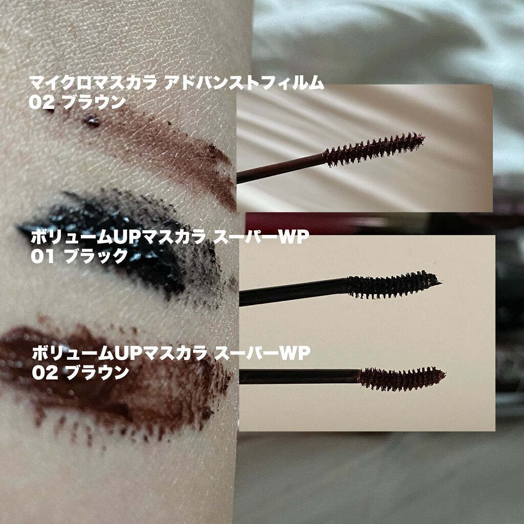 ボリュームUPマスカラ スーパーWP 下まつげもにじみにくくて落ちにくい👍 カールは多少落ちるけど完全に下がることはない感じ✨️ マイクロマスカラ アドバンストフィルム 細めのブラシが不器用な私に使いやすい🙆🏻♀️ 塗布量が少ないのでそこまでにじむかんじはないかな! 1日キープしてしっかりメイクの日は「ボリュームUPマスカラ スーパーWP」、デイリーで使うなら「マイクロマスカラ アドバンストフィルム」がパパッと塗れて個人的におすすめ!