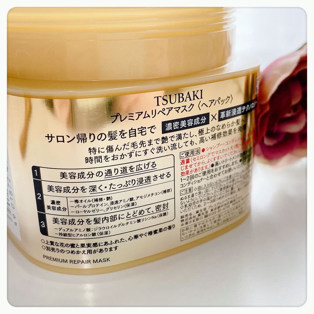 - <つめかえ用> 水、グリセリン、ジメチコン、イソペンチルジオール、水添ナタネ油アルコール、ベヘントリモニウムクロリド、ステアリルアルコール、ソルビトール、アミノプロピルジメチコン、ヒドロキシエチルウレア、アルキル(C12,14)オキシヒドロキシプロピルアルギニンHCl、ステアルトリモニウムクロリド、乳酸、ツバキ種子油、ラウロイルグルタミン酸ジ(フィトステリル/オクチルドデシル)、ジラウロイルグルタミン酸リシンNa、ローヤルゼリーエキス、アセチルヒアルロン酸Na、加水分解コンキオリン、イソプロパノール、セタノール、オクチルドデカノール、エタノール、クエン酸、乳酸アンモニウム、BG、DPG、AMP、アモジメチコン、PPG-2-デセス-12、トコフェロール、フェノキシエタノール、安息香酸Na、香料、赤227、黄4 <プレミアムリペアマスク> 水、グリセリン、ジメチコン、イソペンチルジオール、水添ナタネ油アルコール、ベヘントリモニウムクロリド、ステアリルアルコール、ソルビトール、アミノプロピルジメチコン、ヒドロキシエチルウレア、アルキル(C12,14)オキシヒドロキシプロピルアルギニンHCl、ステアルトリモニウムクロリド、乳酸、ツバキ種子油、ラウロイルグルタミン酸ジ(フィトステリル/オクチルドデシル)、ジラウロイルグルタミン酸リシンNa、ローヤルゼリーエキス、アセチルヒアルロン酸Na、加水分解コンキオリン、イソプロパノール、セタノール、オクチルドデカノール、エタノール、クエン酸、乳酸アンモニウム、BG、DPG、AMP、アモジメチコン、PPG-2-デセス-12、トコフェロール、フェノキシエタノール、安息香酸Na、香料、赤227、黄4 <S (春ツバキの香り)> 水、グリセリン、ジメチコン、イソペンチルジオール、水添ナタネ油アルコール、ベヘントリモニウムクロリド、ステアリルアルコール、ソルビトール、アミノプロピルジメチコン、ヒドロキシエチルウレア、アルキル(C12,14)オキシヒドロキシプロピルアルギニンHCl、ステアルトリモニウムクロリド、乳酸、ツバキ種子油、ラウロイルグルタミン酸ジ(フィトステリル/オクチルドデシル)、ジラウロイルグルタミン酸リシンNa、ローヤルゼリーエキス、アセチルヒアルロン酸Na、加水分解コンキオリン、イソプロパノール、セタノール、オクチルドデカノール、エタノール、クエン酸、乳酸アンモニウム、BG、DPG、AMP、アモジメチコン、PPG-2-デセス-12、トコフェロール、フェノキシエタノール、安息香酸Na、香料、赤227、黄4 <C(限定パッケージ)> 水、グリセリン、ジメチコン、イソペンチルジオール、水添ナタネ油アルコール、ベヘントリモニウムクロリド、ステアリルアルコール、ソルビトール、アミノプロピルジメチコン、ヒドロキシエチルウレア、アルキル(C12、14)オキシヒドロキシプロピルアルギニンHCl、ステアルトリモニウムクロリド、乳酸、ツバキ種子油、ラウロイルグルタミン酸ジ(フィトステリル/オクチルドデシル)、ジラウロイルグルタミン酸リシンNa、ローヤルゼリーエキス、アセチルヒアルロン酸Na、加水分解コンキオリン、イソプロパノール、セタノール、オクチルドデカノール、エタノール、クエン酸、乳酸アンモニウム、BG、DPG、AMP、アモジメチコン、PPG-2-デセス-12、トコフェロール、フェノキシエタノール、安息香酸Na、香料、赤227、黄4