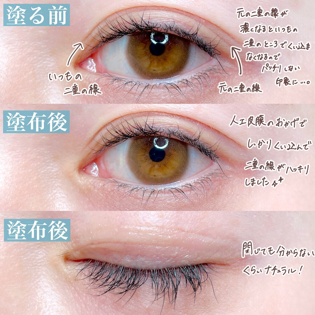 - 2020年6月3日 膜が強くなってリニューアル発売! 塗って乾かすだけのふたえ整形フィルム。見えない膜がふたえをつくり、自然なふたえが完成します。非接着タイプでまぶたを貼り付けないので、目を閉じても自然な仕上がり。まばたきしてもつっぱりません。水・汗に強いウォータプルーフでクッキリふたえをキープ。うるおい成分のヒアルロン酸・コラーゲン配合。