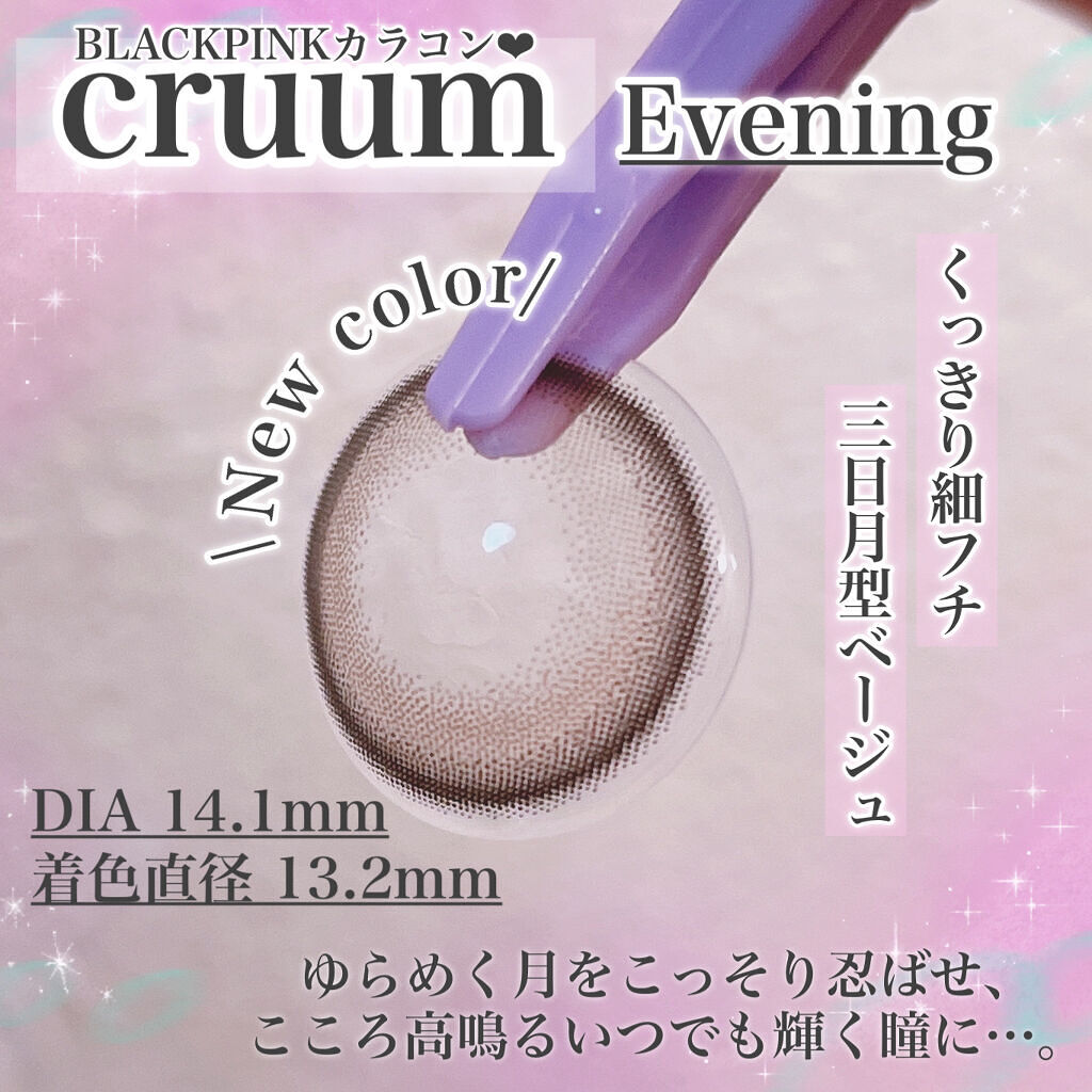 三日月デザインのカラコンはもはや定番デザインになりつつあるけどそこはやっぱり"CRUUM"はっきり発色のドットグラデーションで他と差がつけられそう🌙 こんなに高発色なのに細フチのおかげで自然に馴染んで浮かないので普段使いにもおすすめです。 Eveningは"韓国っぽ"なカラコンは可愛いけど、派手になりそうで難しそうって思っていた人にもつけやすいレンズだと思います!もちろん既存カラーも可愛くておすすめのCRUUM。