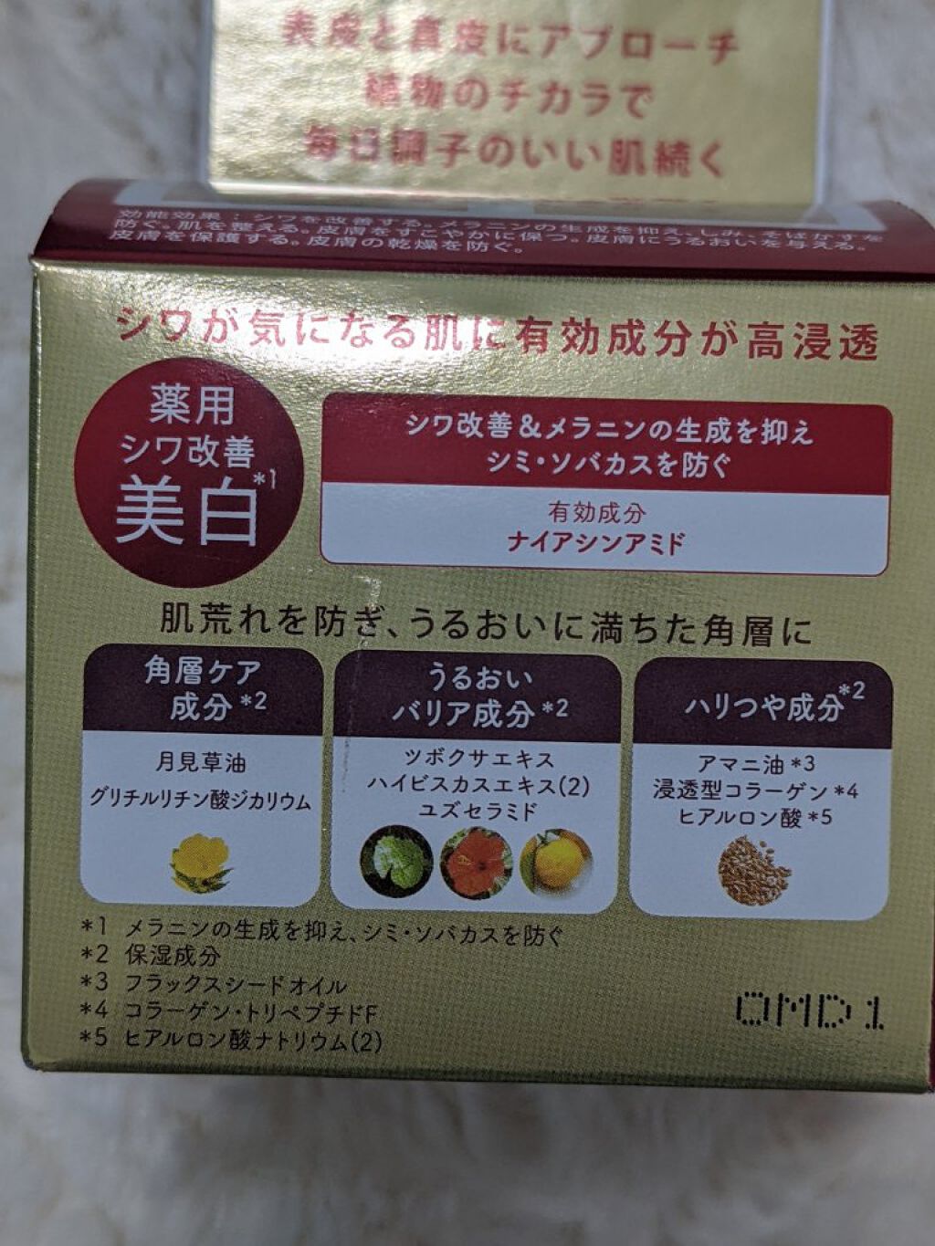 - <80g> フェノキシエタノール、セタノール、ツボクサエキス、セスキオレイン酸ソルビタン、濃グリセリン、リンゴ酸ジイソステアリル、ブチルカルバミン酸ヨウ化プロピニル、カルボキシビニルポリマー、グリチルリチン酸ジカリウム、ヒアルロン酸ナトリウム(2)、精製水、メチルポリシロキサン、エデト酸二ナトリウム、ナイアシンアミド、1,3-ブチレングリコール、ポリオキシエチレン硬化ヒマシ油、自己乳化型モノステアリン酸グリセリル、月見草油、d-δ-トコフェロール、ショ糖脂肪酸エステル、2-エチルヘキサン酸セチル、ポリアクリル酸アルキル、親油型モノステアリン酸グリセリル、グリセリンモノ2-エチルヘキシルエーテル、L-アルギニン、シリコーン樹脂、ユズセラミド、流動イソパラフィン、ジリノール酸ジ(フィトステリル/イソステアリル/セチル/ステアリル/ベヘニル)、コンフリーエキス、セチルリン酸カリウム、高重合メチルポリシロキサン(1)、ハイビスカスエキス(2)、フラックスシードオイル、コラーゲン・トリペプチド F