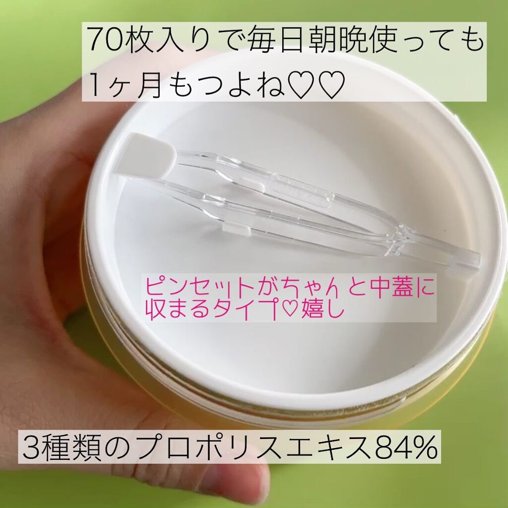 - 1) 3つのプロポリス抽出物84%配合 (フランス産ブラックビプロポリス/ ブラジル産レッドプロポリス/ ブラジル産グリーンプロポリス) 2)ビーガンエンボ生地で拭く時も、貼る時もやさしく使用 エンボス面 – やさしく拭き取る・ 滑らかな面 - 叩いて吸収させる。 <使用方法> 1. 洗顔後のエンボス面で目元を除いた顔全体に肌のキメの方向でやさしく拭きます。 2. パッドをひっくり返して柔らかい面で肌を軽く叩いてエッセンスを吸収させます。 3.使用後にパッドが乾かないように、蓋をしっかり閉めて密封してください。