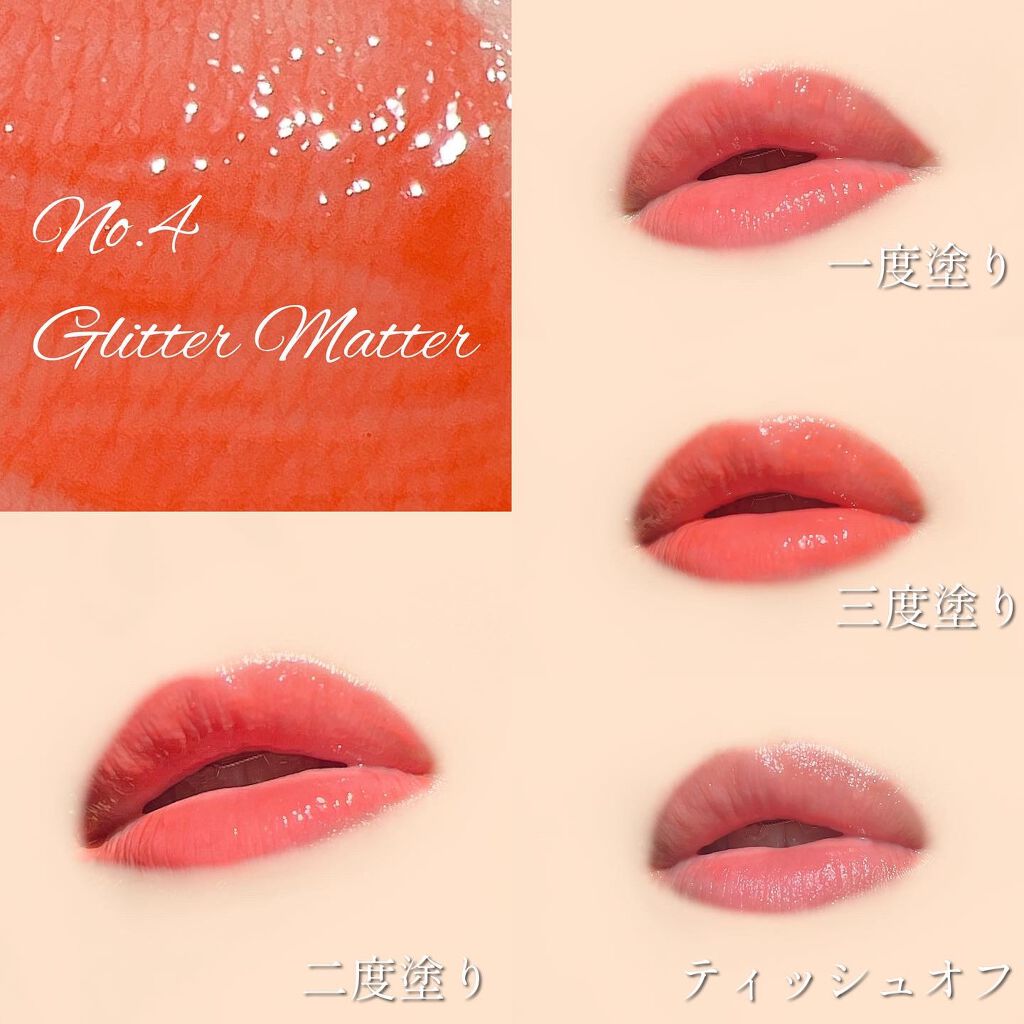 なめらかなつけ心地と落ちにくさすごい✨ ツヤっとしていて透明感もあり☺️ 膜を薄く張ったようなしっとり感で、 塗ってから60秒ほど待ち、 ティッシュオフしてもそのしっとり感は 残っている印象🌼 さらに色移りしにくい仕上がりでした🤍 食べたり飲んだりした時もフチだけ 色残り現象は特になかったです🌱 肌なじみのいいコーラルピンク💕 青みがかわいいモーヴピンクカラー💕 ほどよいテラコッタオレンジ系カラー🧡 青みのあるチェリーレッドカラー🌹 ブラウンレッド系のカラー🤎 ディープレッドカラー🥀