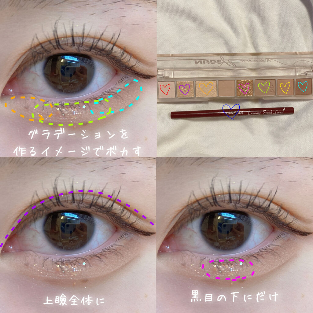 アイシャドウ👀・CLIOプロ アイ パレット01SIMPLY PINK グリッター✨・PERIPERAデュオ ポケット グリッター シャドウ03SALTED SUGARPLUM 涙袋のコンシーラー👧・キャンメイクカラーミキシングコンシーラーオレンジベージュ マスカラ💇♀️・rom&ndハンオールフィックスマスカラL02LONG ASH アイライン✏️・キャンメイククリーミータッチライナーダークブラウン・CEZANNE極細アイライナーEX20ブラウン