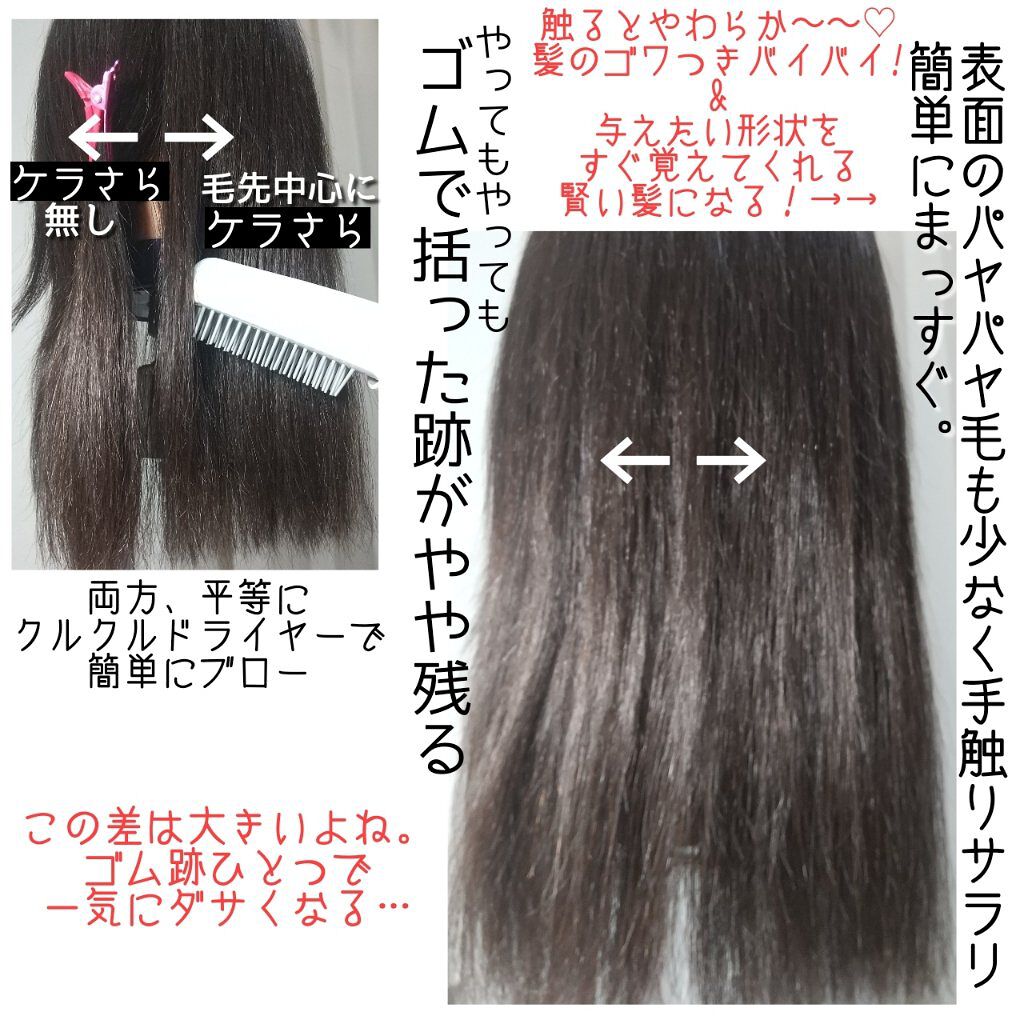 セラミド、コラーゲン、ローヤルゼリー、ツバキ油、ホホバ油など艶や保湿を付与する成分も 美髪オイル(18MEAオイル)も入ってて贅沢❗ 程よい濃度で塗布しやすく、すすいでいる時に滑らかさを実感。 ただ、ドライヤーした直後はうるつやチャージ実感ありで、仕上がり良くても 1時間、2時間と経過する毎に髪の乾燥や手触りの悪さが目立ち始めて、そのまま寝て朝起きたら、いつものゴワつきある手触り、広がる、うねり髪に戻っていました💦(;∀;)
