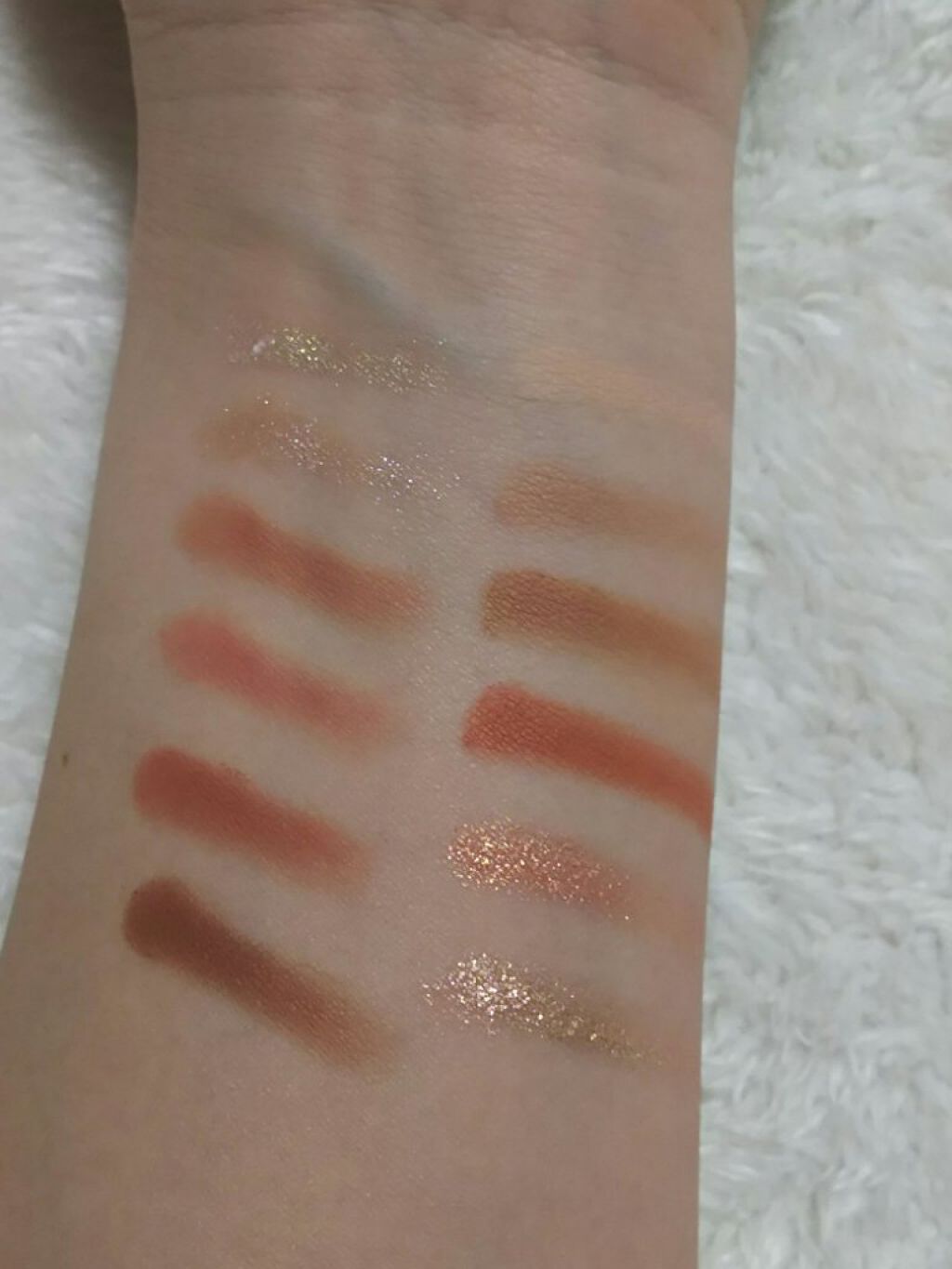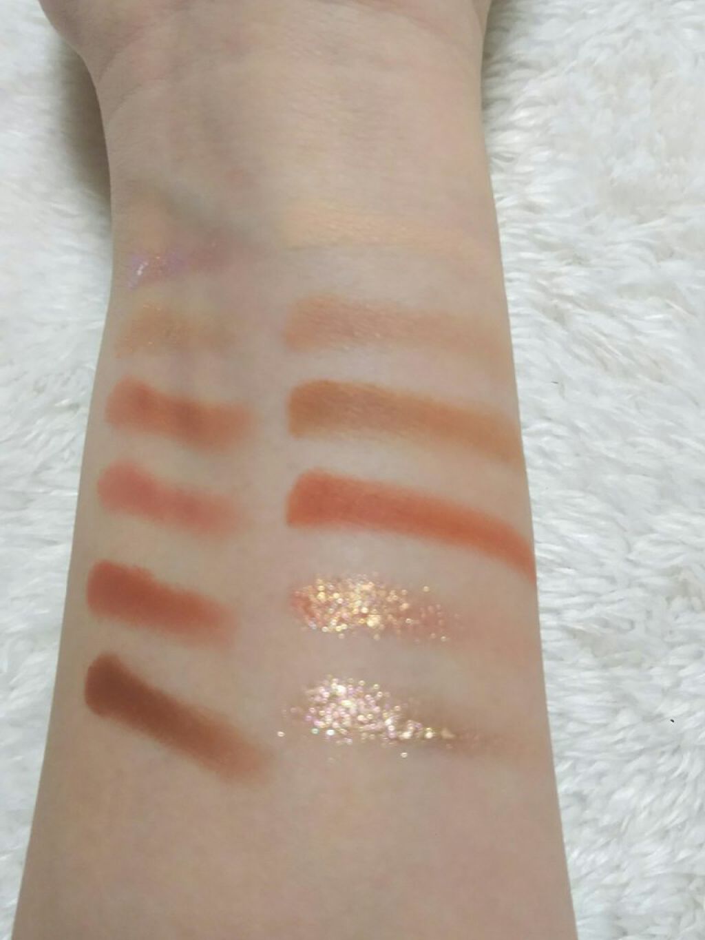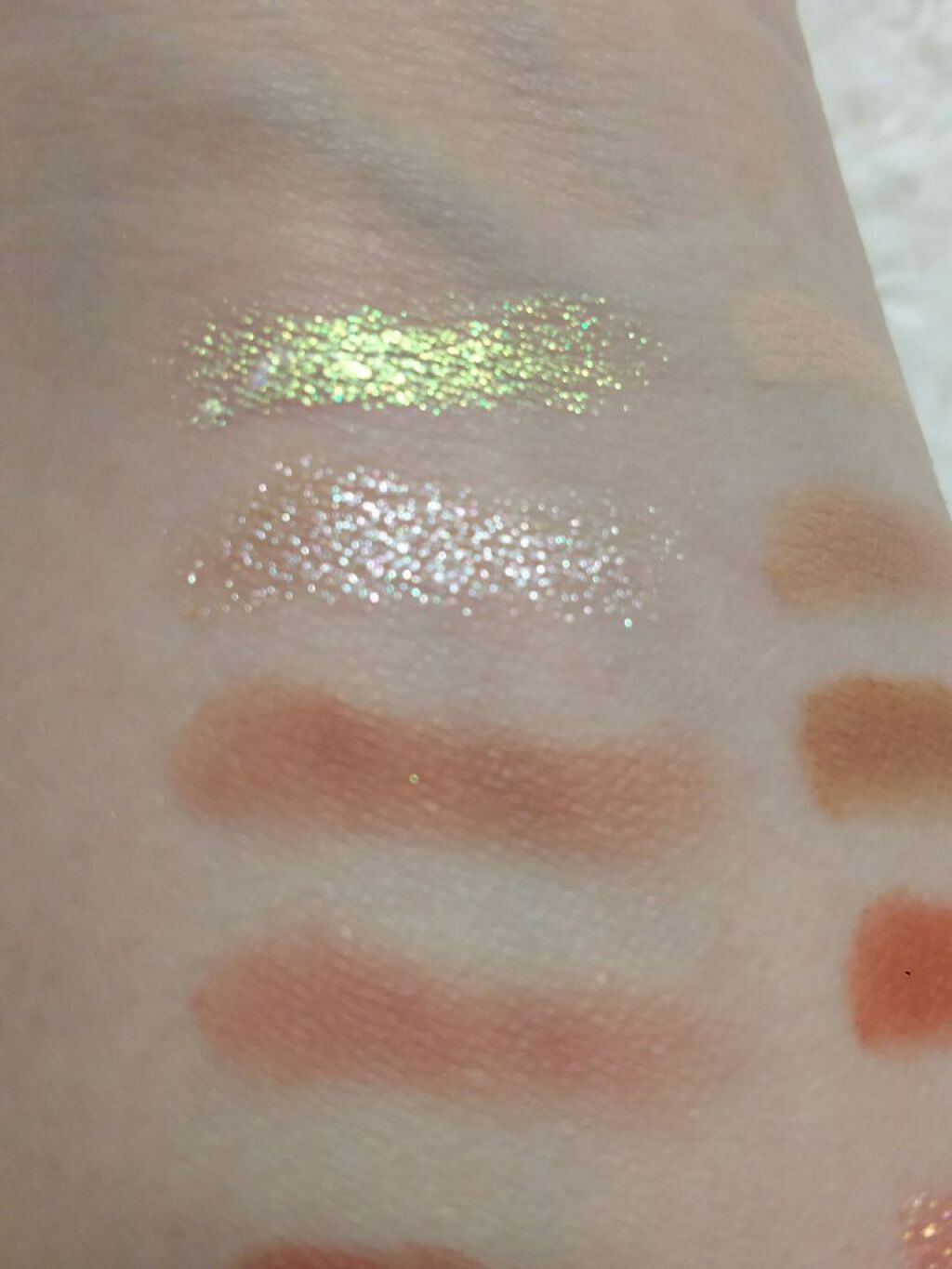 色々なカラーバリエーションがありますが、スタンダードなパレットです。 使いやすい色のセットで、そこまでえげつなく発色するわけではなく、かといって発色しないわけでもないパレットです。 マットの粉はみっしりと詰まっていて、わりとしっかりとした筆じゃないと案外粉が取れないかもしれません。 チップ等が付属していないのはちゃんとした筆を用意してほしいということなのかも……? それはこのキラキラの多色ラメ、粉が緻密で軽すぎて、飛ぶこと…… アイベースを使っていても飛ぶので、結構致命的です。 それでも色はいいし粉もこの値段なら悪くないのでプチプラの中ではおすすめ出来る方です。