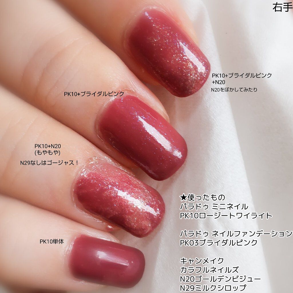 一度塗り…透け感ある。明るみのレッド。 二度塗り…深みが増してエレガント爆発する。透け感はなくなる。 たっぷり一度塗りの明るいレッド可愛いんですけど、色ムラになりがち。 二度塗りすると色ムラわかりにくくなりますよ! よくあるパールのネイルにありがちな刷毛跡もわかりにくく、塗りやすい!(*´﹀`*) とっっってもゴージャスでエレガントな秋ネイルができちまうレッドカラー♡ 真っ赤ネイルよりも色味やパールのおかげで落ち着いたシックな感じ! 秋はもちろん、冬も使いたくなる濃厚レッドです(*´꒳`*)♡ キャンメイクカラフルネイルズ N61ルビーレッドは『大人っぽい赤』が欲しい方にオススメだと思います! パールの光沢ほんとリッチなんで発売日は要チェックです(´✪ω✪`)♡