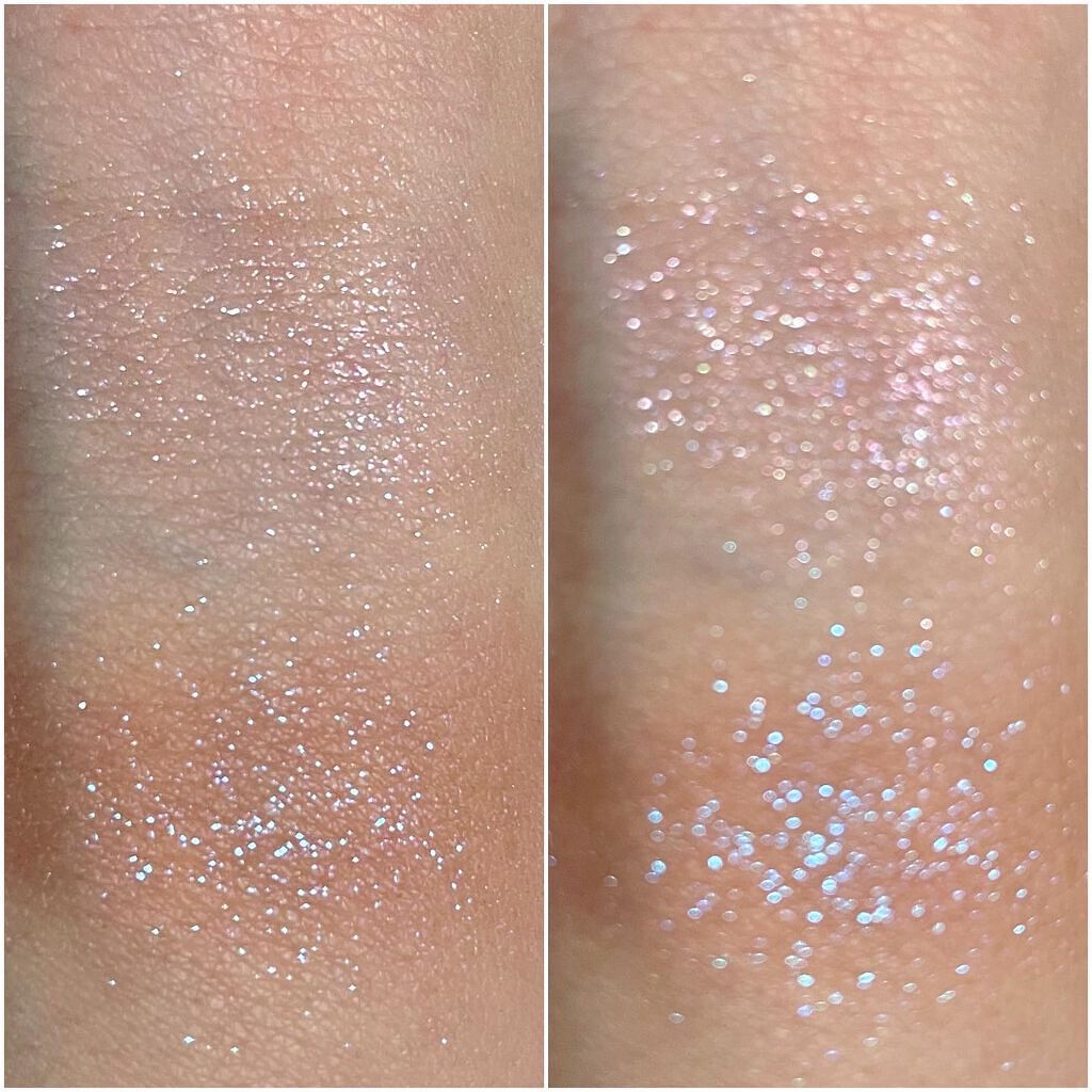 \かわいすぎて事件🤯💘⚡️濡れツヤハイライト/ 上品でキラキラのツヤが美しすぎると発売前から話題でしたね🙌 エナメル+キルティング加工のケースはツルツルぷにぷに♬ 薄型なので持ち運びにも便利!かわいいので無駄に持ち歩こう🙋♀️(?) 細かなピンクパールが温かみのあるツヤを演出してくれます💗 とてもしっとりしたパウダーで粉感がなく、繊細な輝きが長続きします👏 大粒の偏光ラメがギラギラ🤩🥳祭りじゃ〜!といった感じ笑 ホワイトカラーで輝きが目立つので濡れたようなツヤ感が出ます✨ マスクメイクでも頬骨より少し上のCゾーンに入れれば隠れずツヤ感が綺麗に映えます🥰 ラメが大粒で強いのでアイメイクの仕上げに入れても💮 結果万能なのとちょっと奇抜なの♥️ 両方文句なしにかわいかったので満足です🧚♀️笑