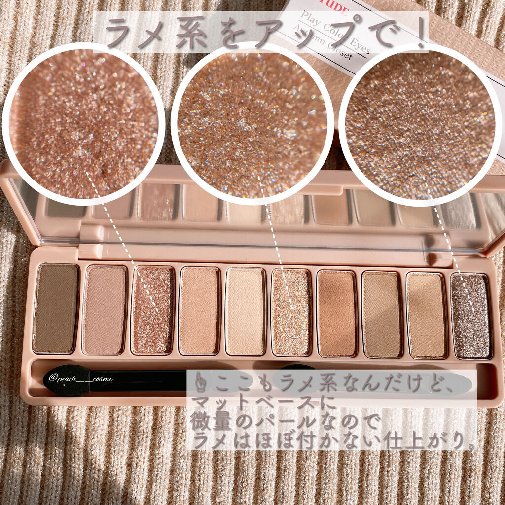 粉質しっとりで高発色。しっとりとまぶたに馴染むし、ぼかしやすいのが良かった🙌🏻 このカラーはパール2色、ラメ1色、マット1色で構成されていてニュートラルなカラーです! ラメはピンク系で、可愛らしさ・女性らしさをプラスしてくれたり、濃く塗りすぎた時に光でぼかしてくれる感じがします☝🏻