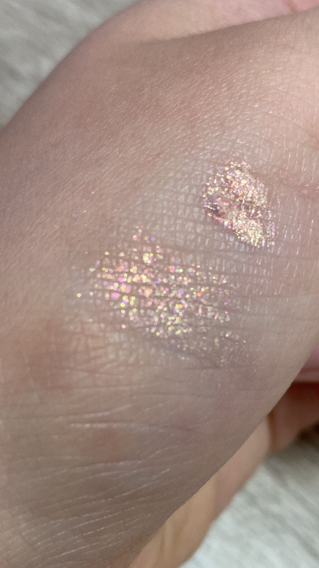 細かいラメと大きめのホログラムが混じっています꒰ˆ•ﻌ•ˆ꒱ 瞬きする度にキラキラしてかわいいです。 よく見ると色々なカラーのラメでてきていますがつけると自然ですฅʕ •ﻌ• ʔฅ