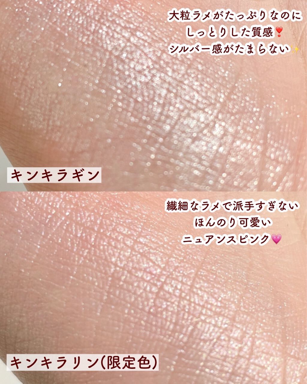 コレはモテ確定のアイシャドウと私の中で決定した 左上: 偏光パールがチラつく珍しいピンクカラー 右上:ホワイトやピンクのラメが煌めくカラー 真ん中: 柔らかいパール入りのベージュ 左下:シアーな赤。少し温かみのあるコーラル感も感じます 右下:マットカラーの赤みのあるブラウン これはね、動画でも伝わらないぐらいラメが繊細で可愛いんだよね😍 女の子らしさが溢れんばかりの儚げピンク💗